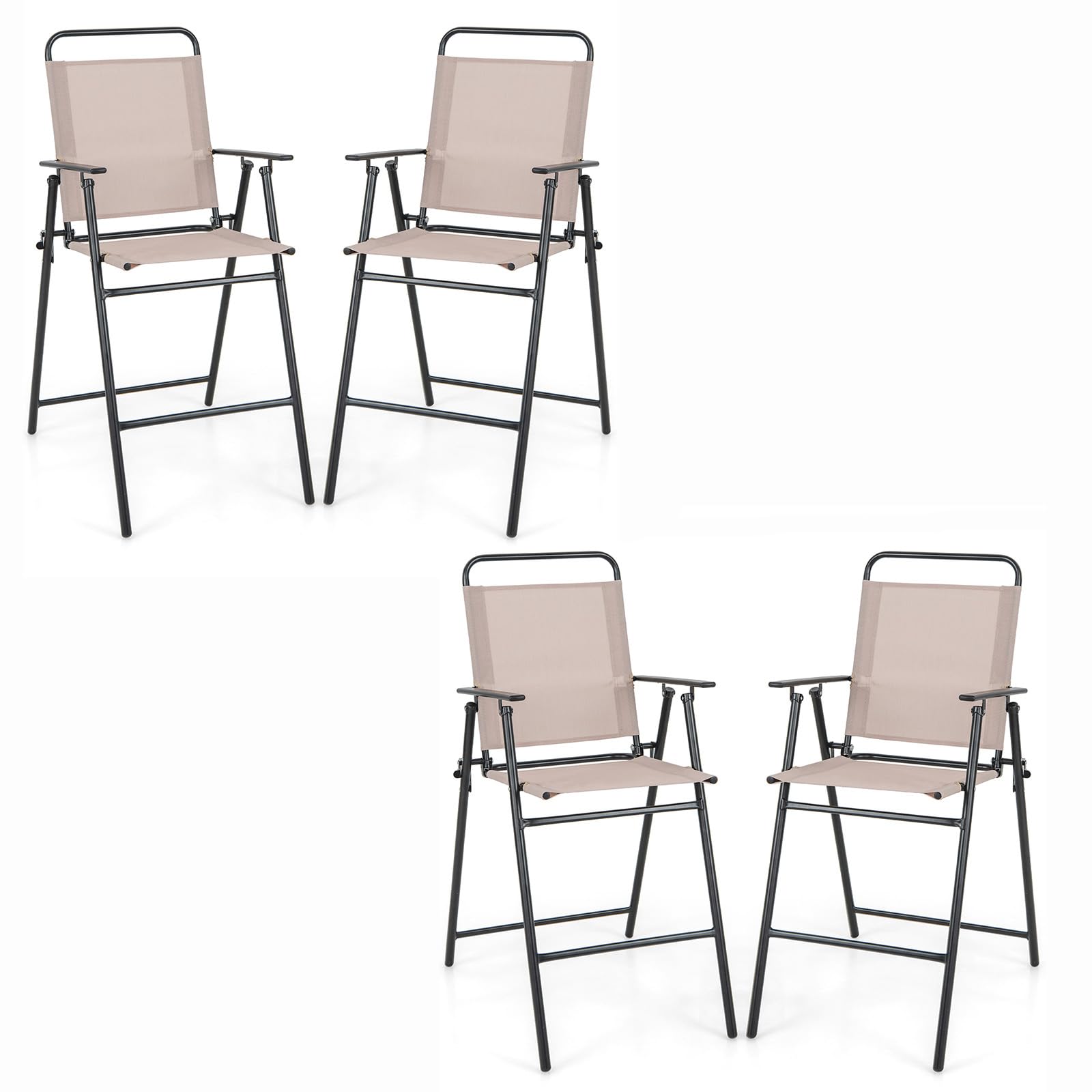 Our folding bar stool set includes 2/4 outdoor dining chairs and the stool measures 21" x 27" x 44" (L x W x H). The seat height is 63 cm/24". With their foldable and portable design, these stools are easy to carry and store, making them perfect for outdoor gatherings, picnics, camping trips, and more. The seat area is crafted of breathable mesh fabric, providing optimal comfort even during extended periods of use. More than that, ergonomically designed, the backrest conforms to the natural curves of the body, while the inclusion of armrests and footrests enhances overall comfort. Besides, the stool is supported by high-strength powder-coated metal tubes, ensuring long-lasting durability and reliable support. Enhance your outdoor living space with our versatile and modern outdoor bar stool set.