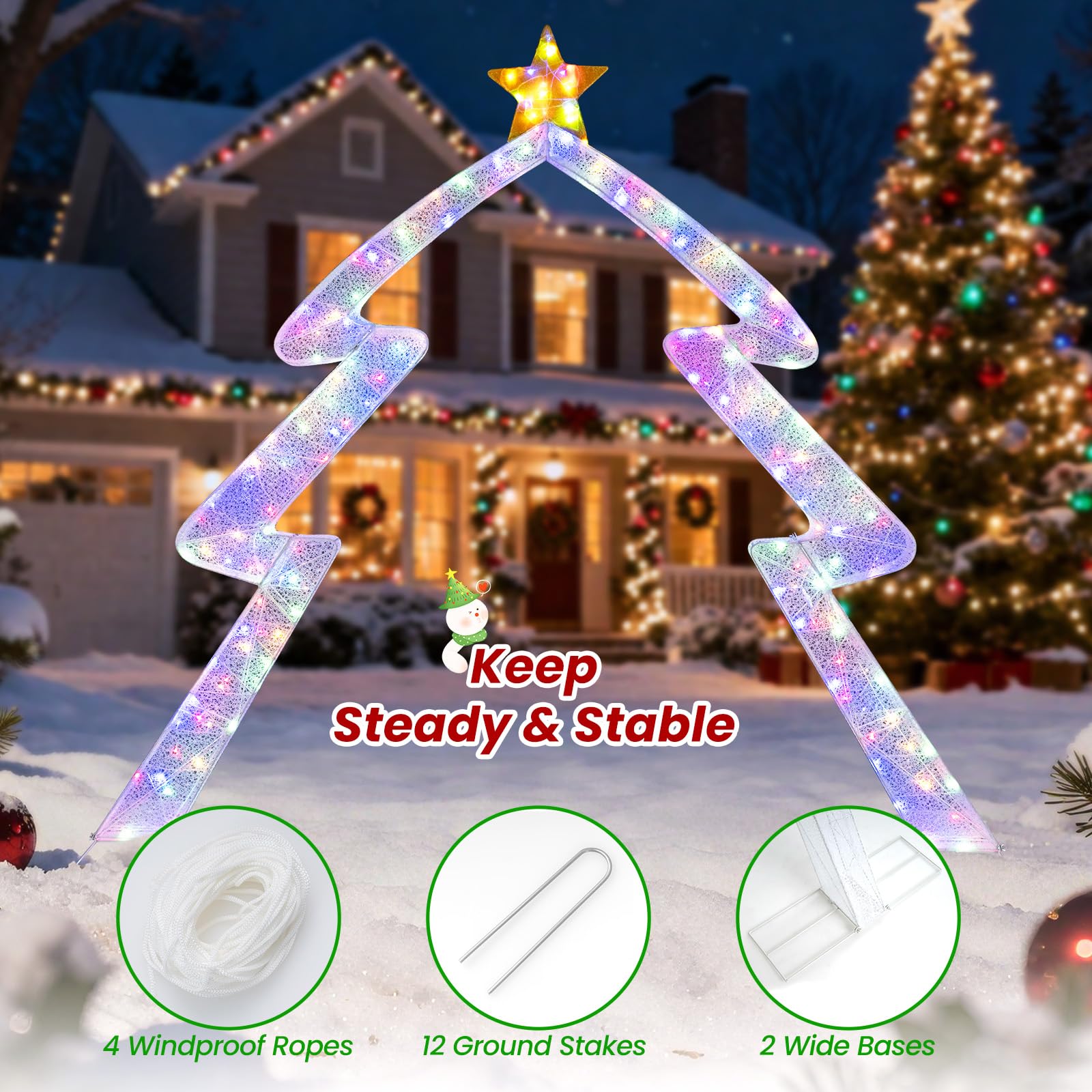 Celebrate the holidays with our 10.4 ft pre-lit Christmas archway!Featuring a large bow decoration and warm white LED lights, the Xmas arch creates a welcoming gateway, delighting your family members, friends, and passersby. With premium polyester fabric, the archway is suitable for outdoor use. Built with a robust metal frame and widened bases, the outdoor arch remains upright and steady throughout the season. It also comes with windproof ropes and ground stakes for higher stability. The versatile archway not only spreads cheer, but also creates memorable moments.