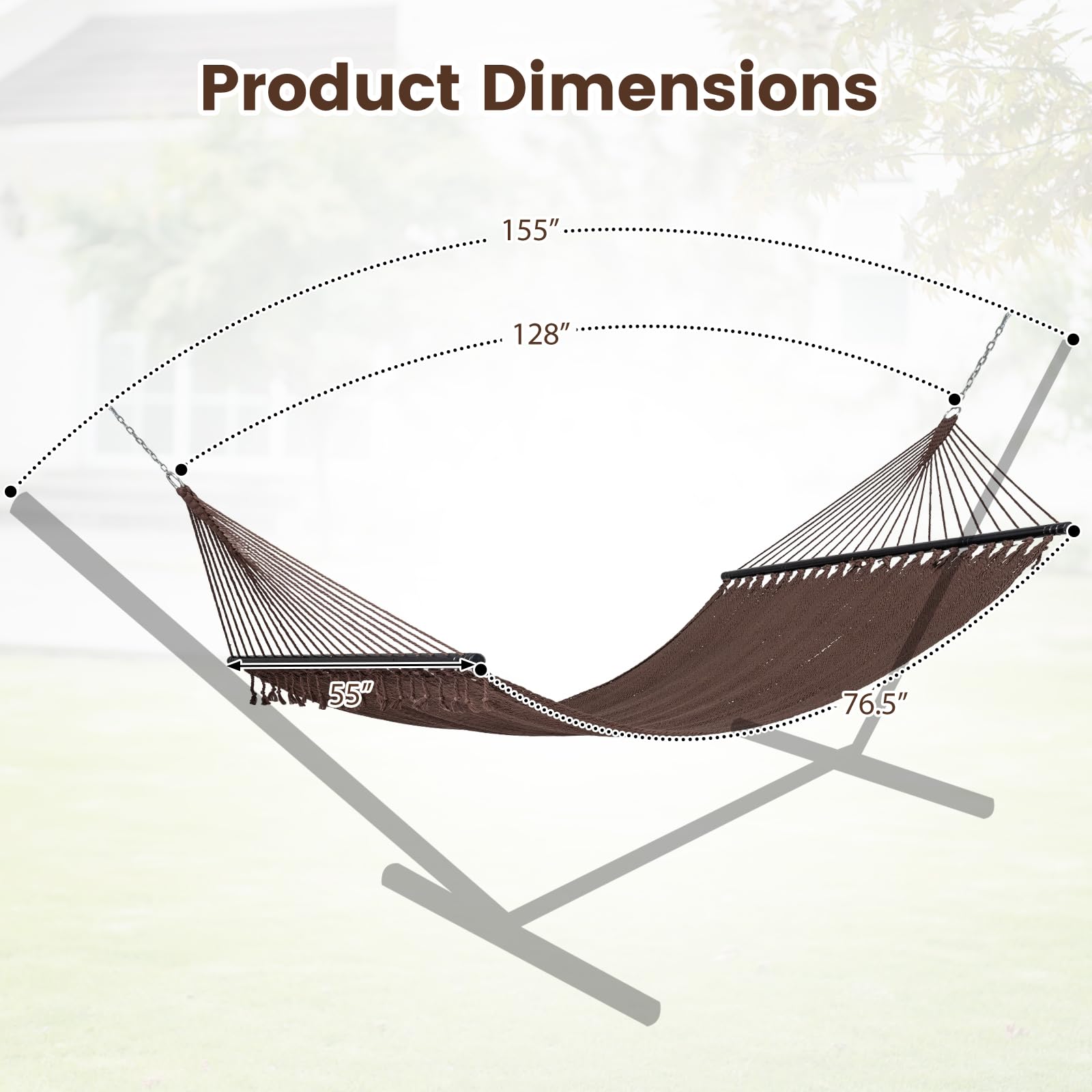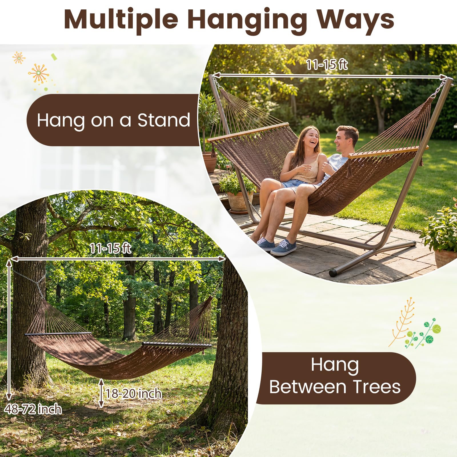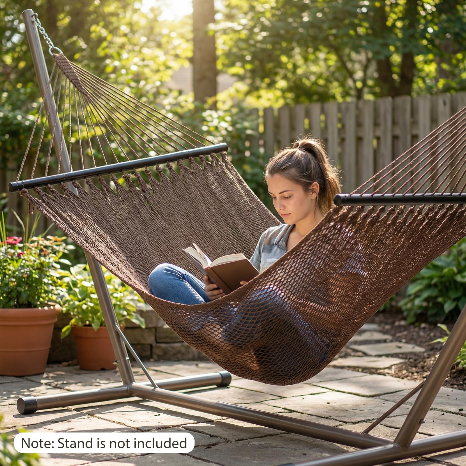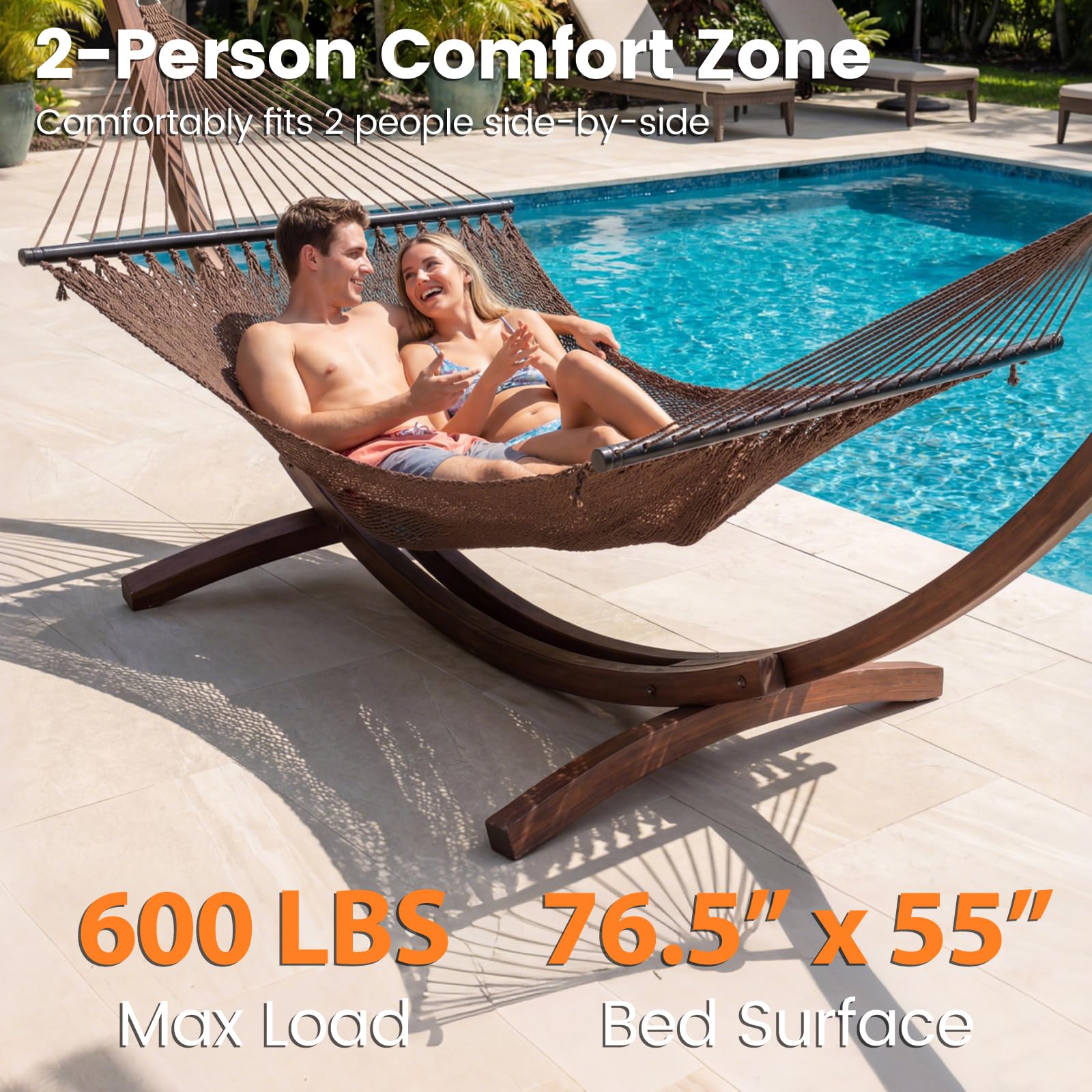 With a generous 76.5” x 55” bed and a 600 lbs weight capacity, the hammock offers ample space for side-by-side relaxation. Its flat lay spreader bars ensure a stable, open surface, while reinforced end-cord bunching provides balanced support. The quick-drying, wear-resistant Caribbean-style fabric combines style with durability, perfect for patios or poolside lounging. Adjustable chains fit most 11-15 ft stands, making it your ideal outdoor getaway companion.