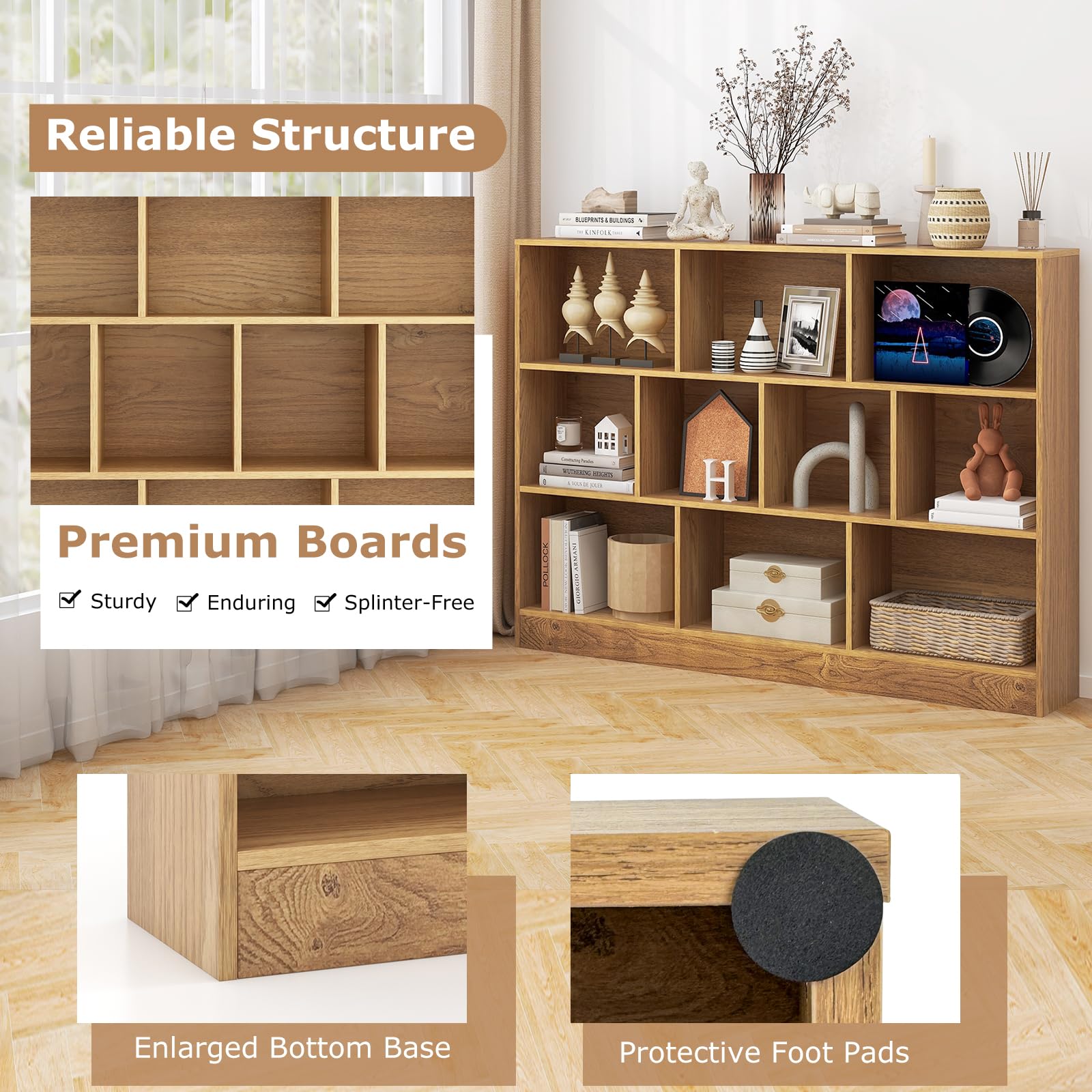- Multi-Scene Use: The 10-cube bookshelf is designed with innovative anti-slip foot pads, making it a safer choice for various places, be it your family room, study, or office. These pads effectively protect your floors from scratches.