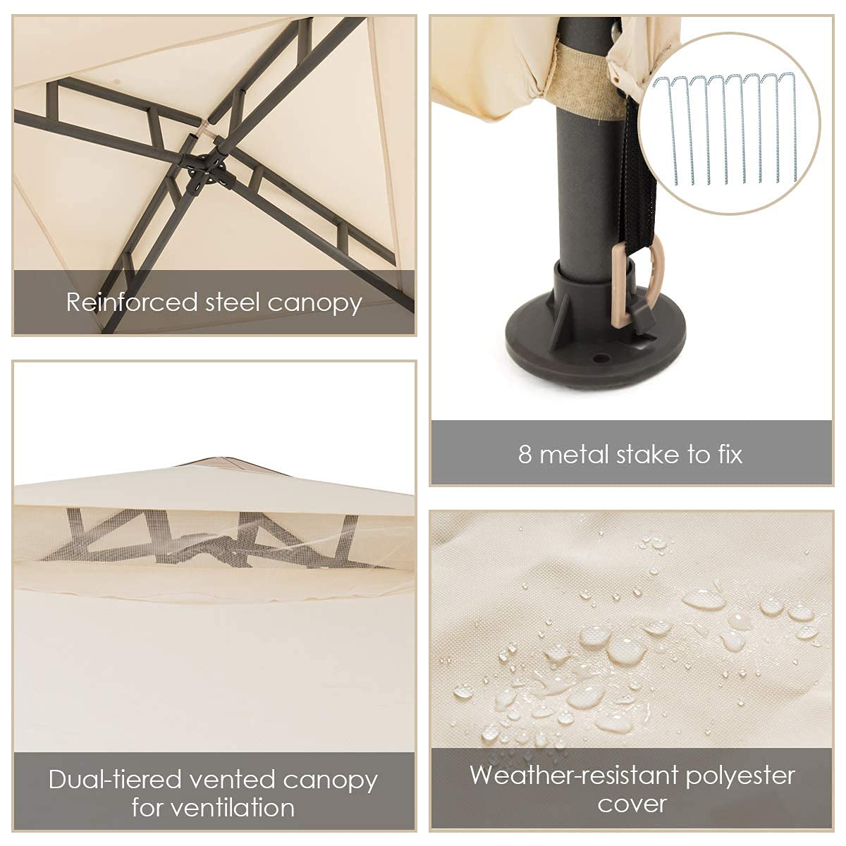 • Meticulous Design: Our gazebo canopy design with a double-tier roof, keep airflow adequately but keeps rain and wind out. Meanwhile, the extended top fabric cover with grommets helps ensure proper water drainage. It will keep you cool when relaxing in the summer and preserve your shelter for seasons to come.