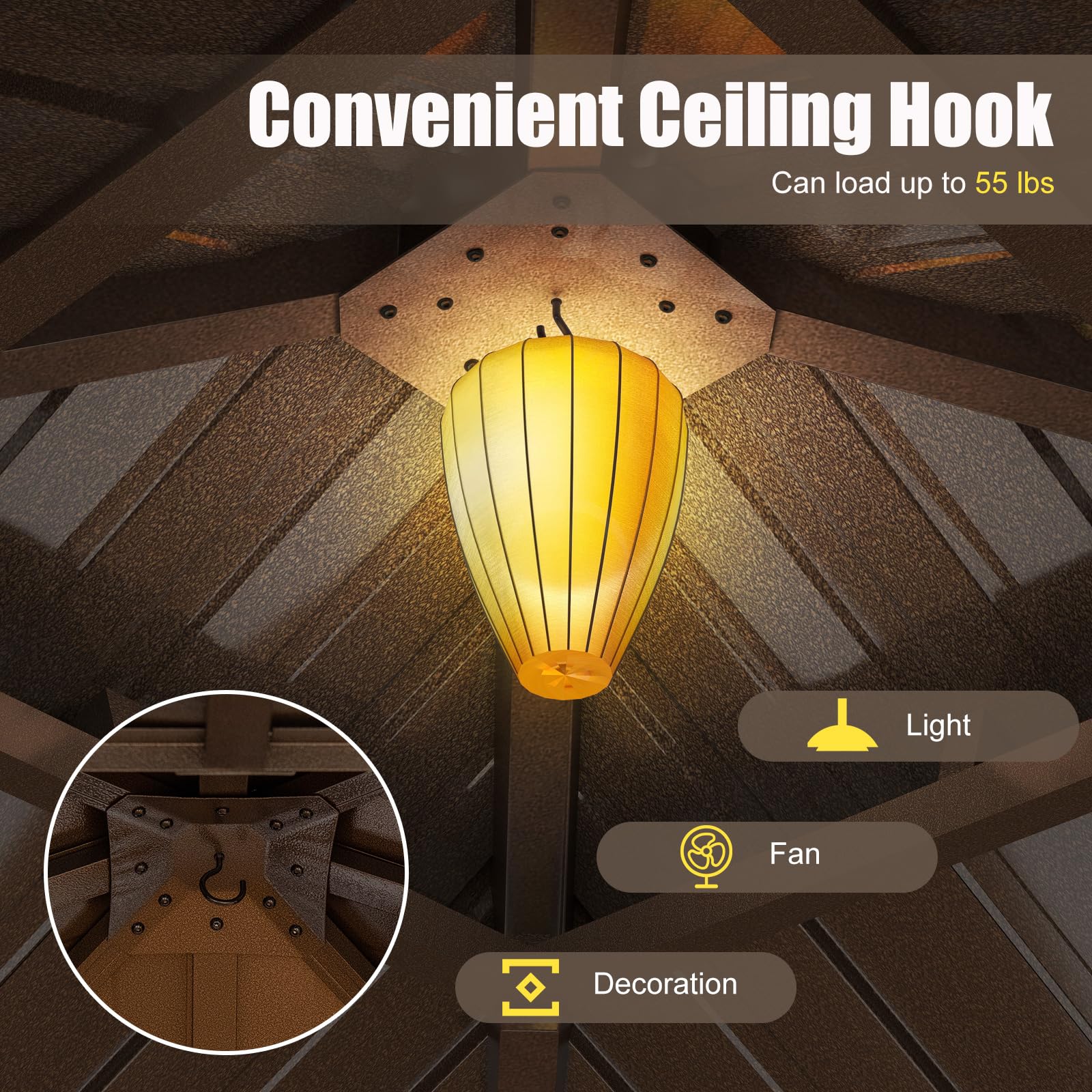 Enhance Your Outdoor Living Space! Our 10 x 10 ft/294 x 294 cm hardtop gazebo comes with a double-layer galvanized metal roof, ensuring good ventilation while offering superior protection from sun, rain, wind, and snow, which is a perfect year-round heaven for outdoor gathering. The aluminum frame is engineered for durability and stability, resistant to rust and reinforced with anchoring plates, including 12 expansion screws for securing of concrete floors, ensuring it remains securely anchored in place even during rough weather. Besides, featuring integrated double-layer sidewalls, complete with mesh netting and zippered curtains, you can enjoy an intimate setting free from “unexpected guests” and prying eyes, or open up to let the breeze flow through on warmer days. The addition of a ceiling hook provides versatile options to enhance the ambiance, easily hanging a light, fan, or flower basket to customize your setup for any event. From leisurely afternoon tea to lively evening parties, this gazebo is spacious enough to host a variety of activities!