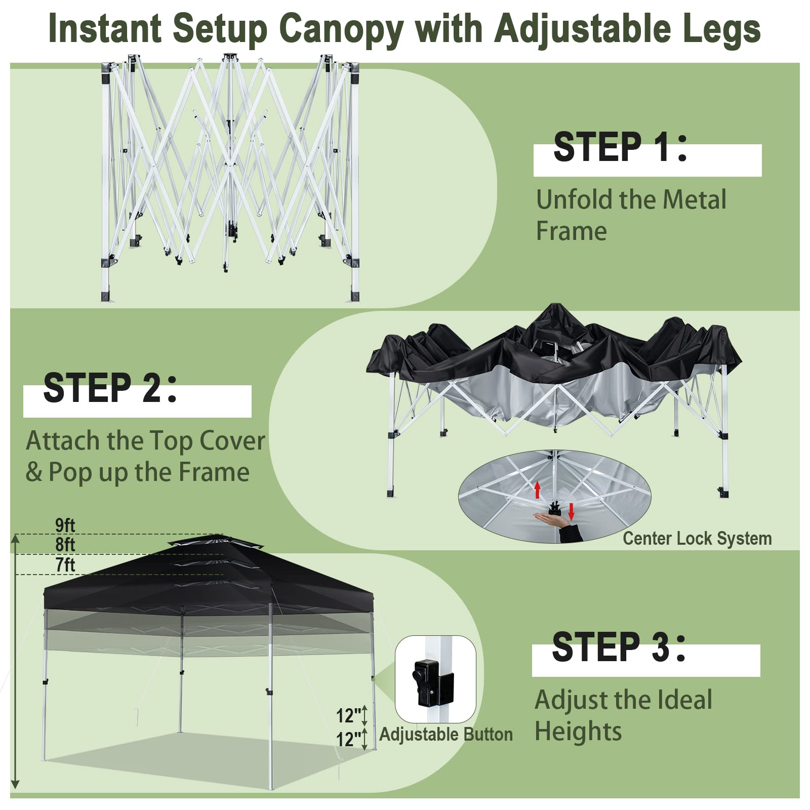 - Easy Setup Pop-up Canopy: With the convenient pop-up design and one-touch center lock mechanism, you can easily secure and release the metal frame. Then you just need to attach the top cover and adjust the ideal height to obtain a complete outdoor shelter canopy in a short time without any additional tools.