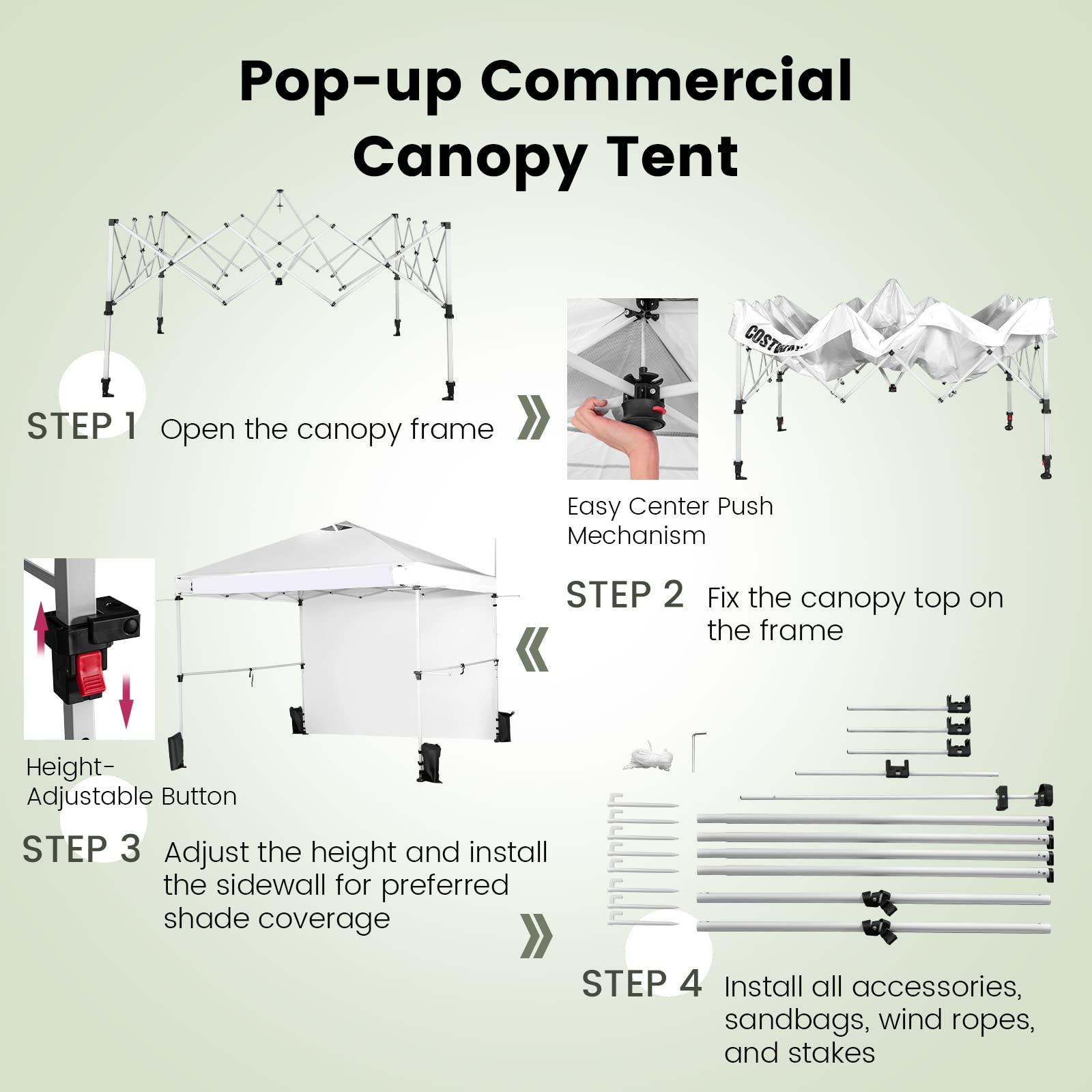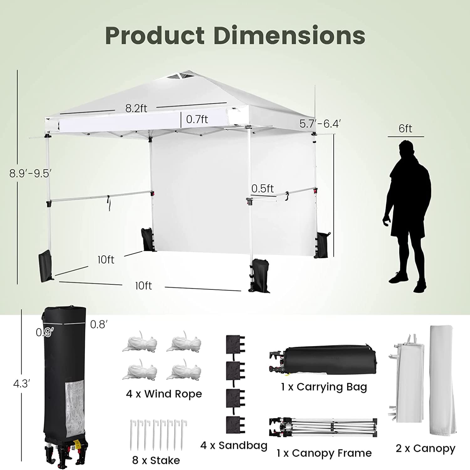 Our commercial instant canopy tent with a sidewall measures 10 ft x 10 ft x 8.9-9.5 ft (L x W x H) and provides 100 sq. ft of shade coverage. The pop-up canopy can be quickly set up with the center lock on the top. 2 built-in wheels on the bottom of the frame allow you to move it around easier along with a carrying bag. 2 hanging bars, 4 crossbars, 1 vertical bar, 1 banner strip are equipped for hanging baskets, clothes, flags, blackboards, banners, making your booth more visible and attractive in the market. Durable oxford fabric with PU coating is UPF 50+, CPAI-84 flame resistant, and rain resistant. In addition, there are 4 wind ropes, 8 stakes, and 4 sandbags for more stability.
