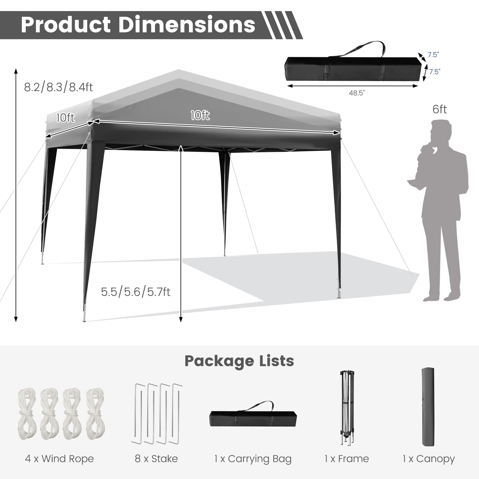 - Large Shading Area: The canopy tent measures 10 ft x 10 ft x 8.2-8.4 ft (L x W x H) and provides 100 sq.ft of shade coverage, allowing you to enjoy comfortable outdoor leisure time with your friends or family. More than that, the height can be adjusted in 3 positions (8.2 ft, 8.3 ft, 8.4 ft), meeting different needs.