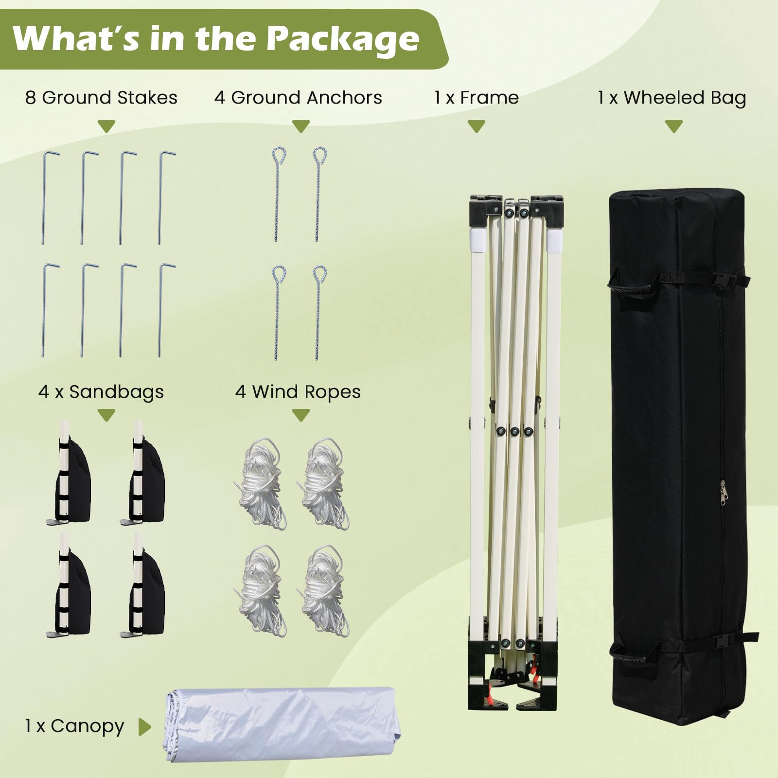 4 wind ropes, 4 stakes, base plate and 8 ground anchors are included to firmly secure the tent