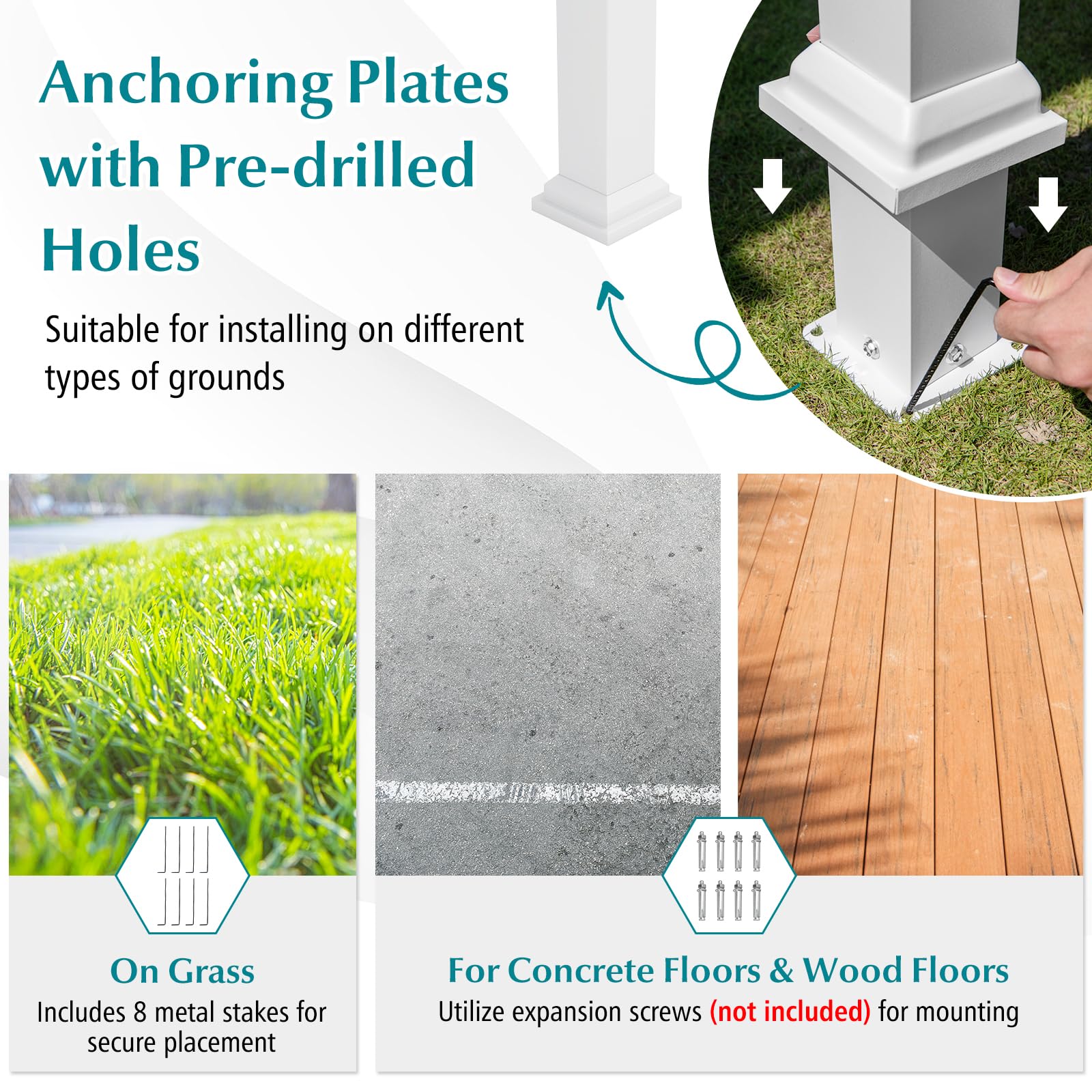- Great Wind Resistance: The aluminum pergola boasts anchoring plates with pre-drilled holes, which are suitable for installing on different types of grounds. The package includes 8 metal stakes for secure placement on grass. Furthermore, for concrete floors or wood floors, you can utilize expansion screws (not included) for mounting.