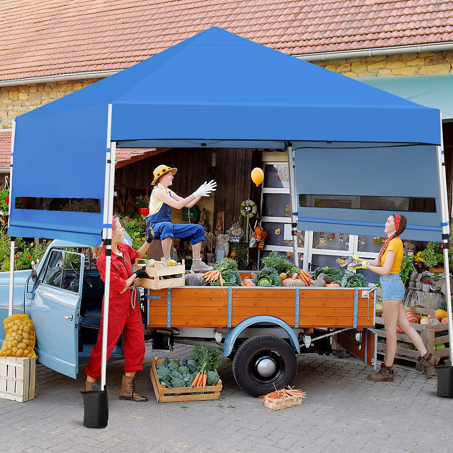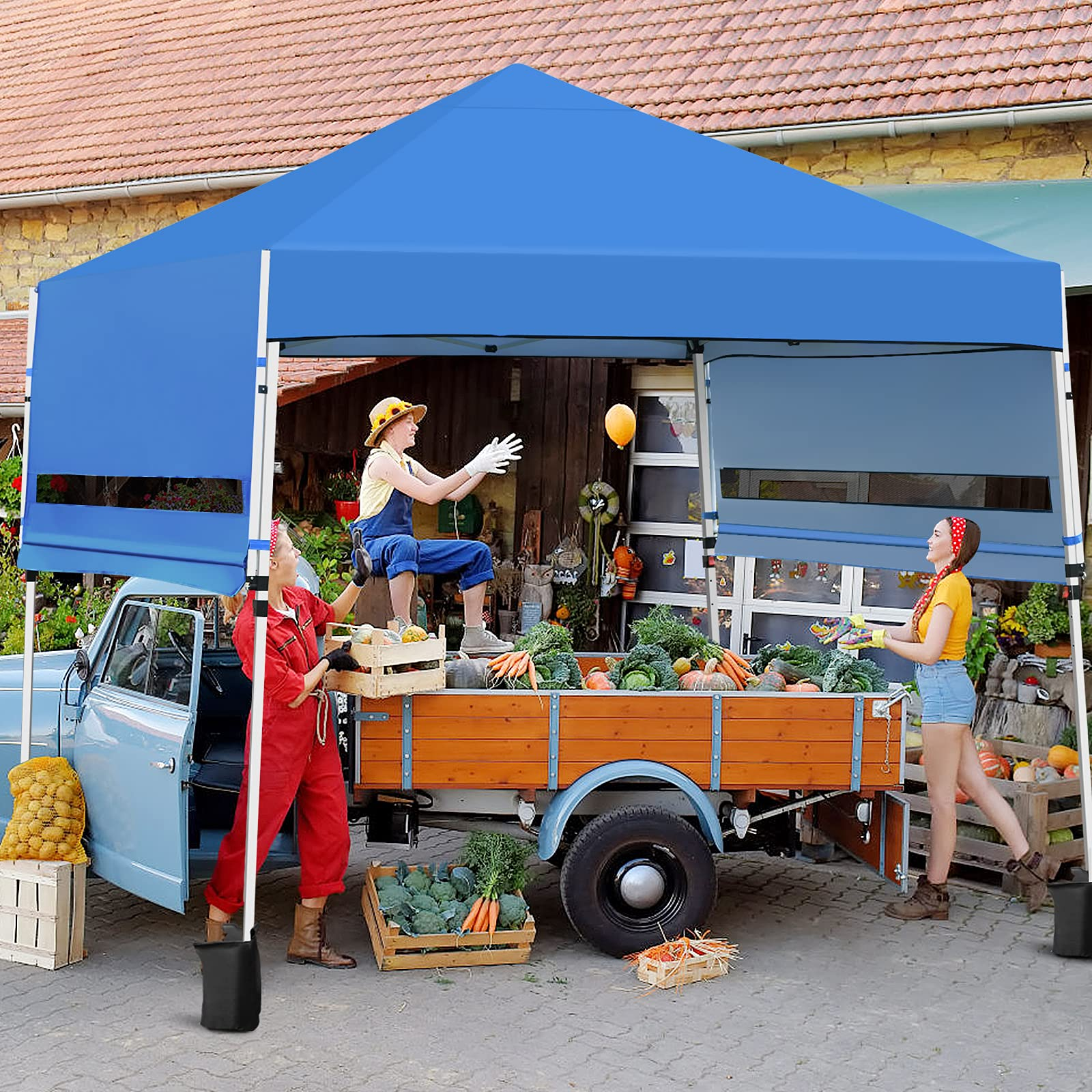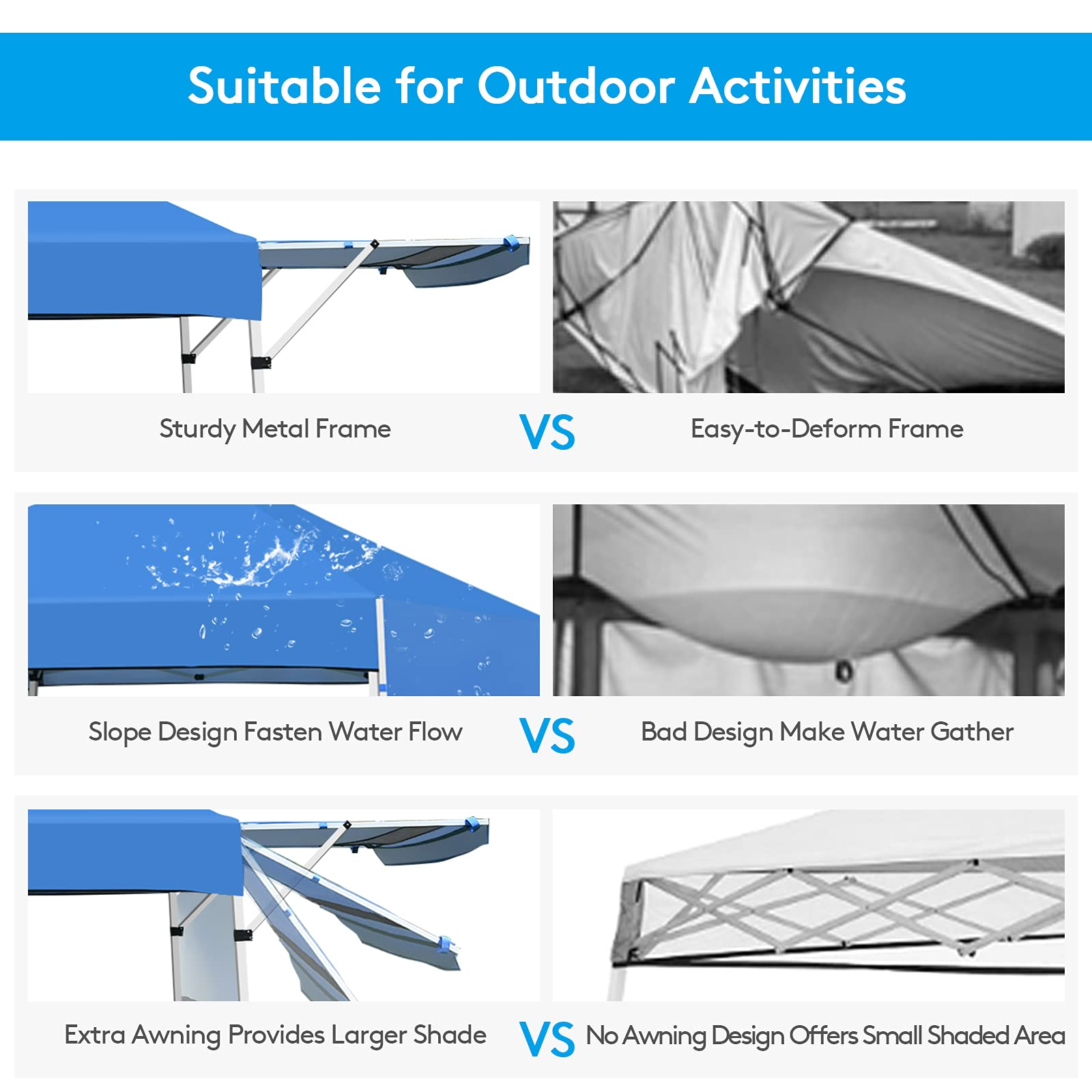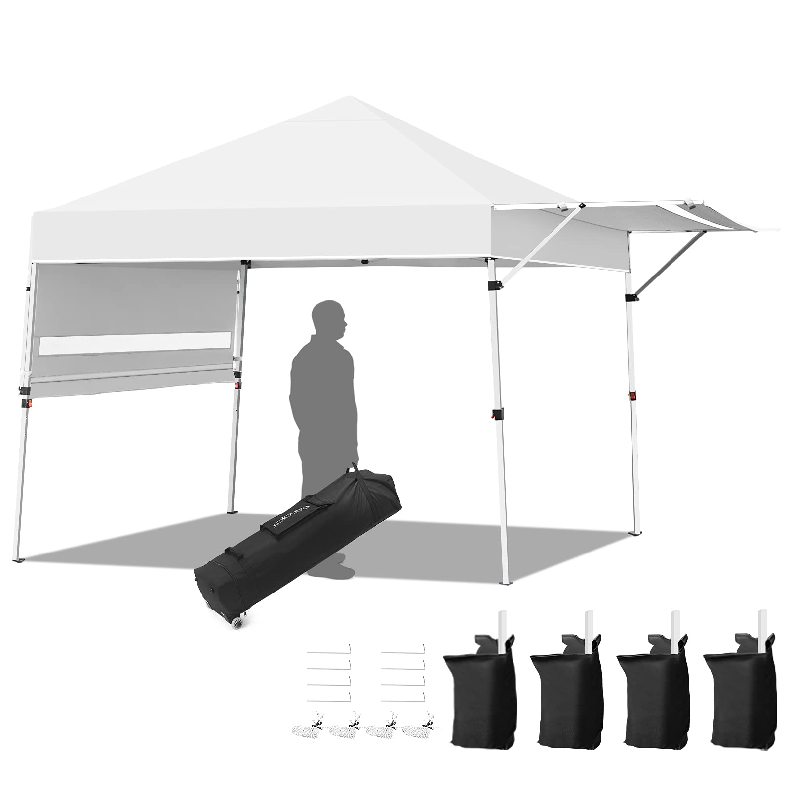 Our pop-up canopy provides you with a cool and comfortable place to relax and enjoy the beautiful outdoor scenery. Constructed with a sturdy metal frame and weather-resistant cover, this sun shelter ensures long-term use. Plus, extra four sandbags and metal stakes enhance durability and safety while using. Since the 3 adjustable heights, you can easily set a humanized height as needed. And dual side awnings can be changed into 3-position inclination, creating additional shade and protection. Covered by a sunlight-blocked canopy awning, our instant shelter can offer 170 square feet of shade coverage. So you can enjoy the breeze under the shade in outdoor activities, such as camping, marketing, and BBQ. When it is not in use, you can fold the tent into a wheeled carrying bag, which facilitates storage and transportation. Take this sunshade tent on the camping trip and enjoy a joyful time!