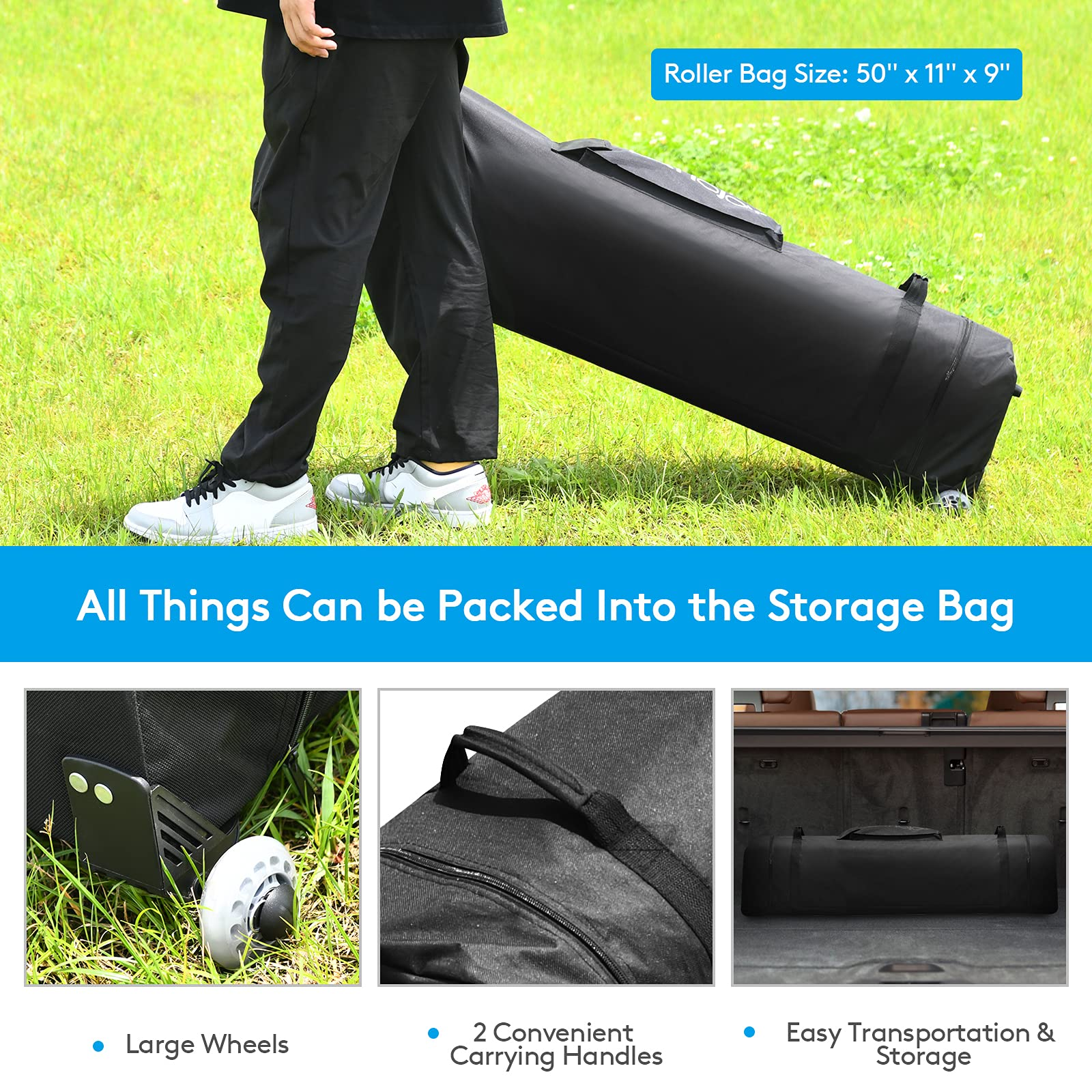 The folding tent can be packed into a roller bag for storage & carrying