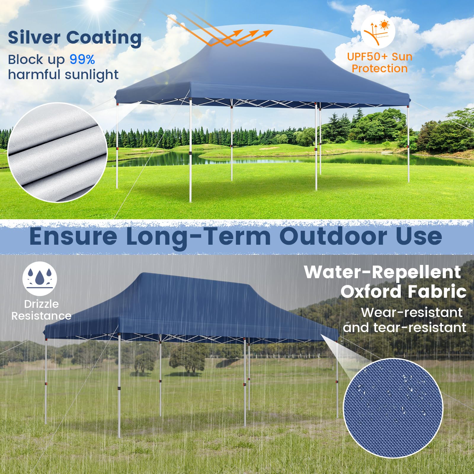 Constructed with a sturdy frame made of heavy-duty powder-coated metal, our tent ensures long-term outdoor use. The oxford fabric canopy is coated with silver, providing exceptional UPF50+ sun protection. For added stability and safety, we include 12 metal ground stakes and 6 wind ropes to firmly secure the canopy to the ground. The pop-up canopy tent is a spacious outdoor shelter with 10 x 20 ft shading area and an adjustable height of 9.7-10.4ft, which can accommodate approximately 15-20 people. And you can adapt to different occasions with 3-level adjustable heights. Thanks to the pop up design, the outdoor shelter can be setup with ease. To make transportation and storage hassle-free, we provide a portable carrying bag. Therefore, the 10x20 pop up canopy is a perfect choice for outdoor events and gatherings.