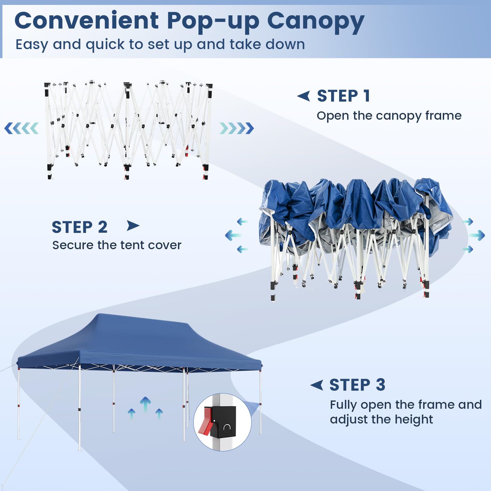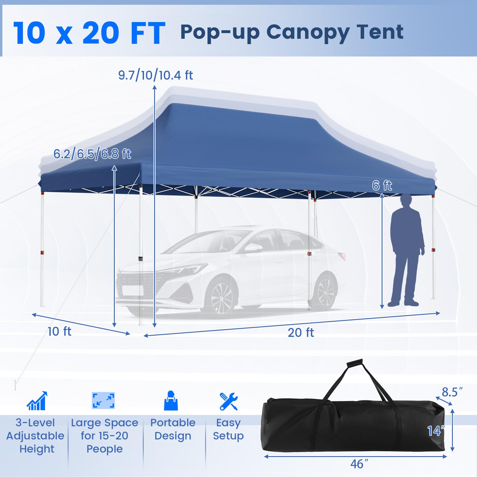 - Spacious Adjustable Shelter: The 10x20ft pop-up canopy is designed to create the generous space for 15-20 people. With adjustable legs, the instant tent shelter features 3 height positions ranging from 9.7-10.4ft, offering flexibility for different occasions.