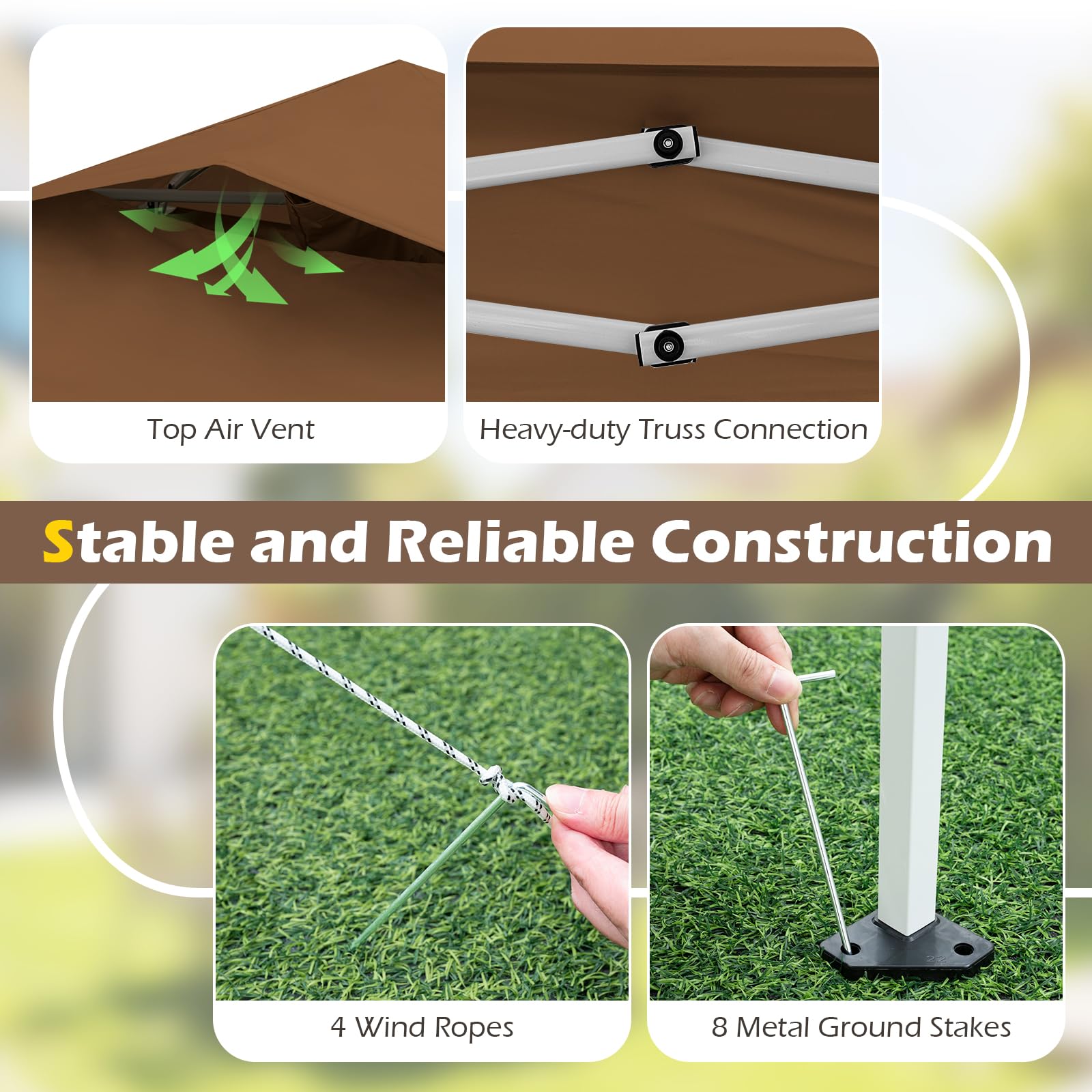 Our outdoor pop up canopy tent features an innovative one-push locking mechanism, which allows for quick and easy setup and takedown, seamlessly operated with one hand and in seconds. Measuring 11.5 x 11.5 x 8.2-8.8 ft (L x W x H), with a 3-level adjustable height and a convenient carrying bag, it is perfect for camping, garden gatherings, or patio relaxation. And there are 4 zippered mesh sidewalls that maintain good ventilation while blocking "unwelcome guests". Crafted from premium 210D Oxford canopy with silver coating, the gazebo provides excellent UPF50+ sun protection and remarkable tear strength, ensuring reliable coverage for any outdoor event. Additionally, the screen tent features a top air vent for better ventilation and wind resistance, sturdy truss connectors, and ground stakes with wind ropes, combining comfort, stability, and peace of mind for your backyard celebrations.