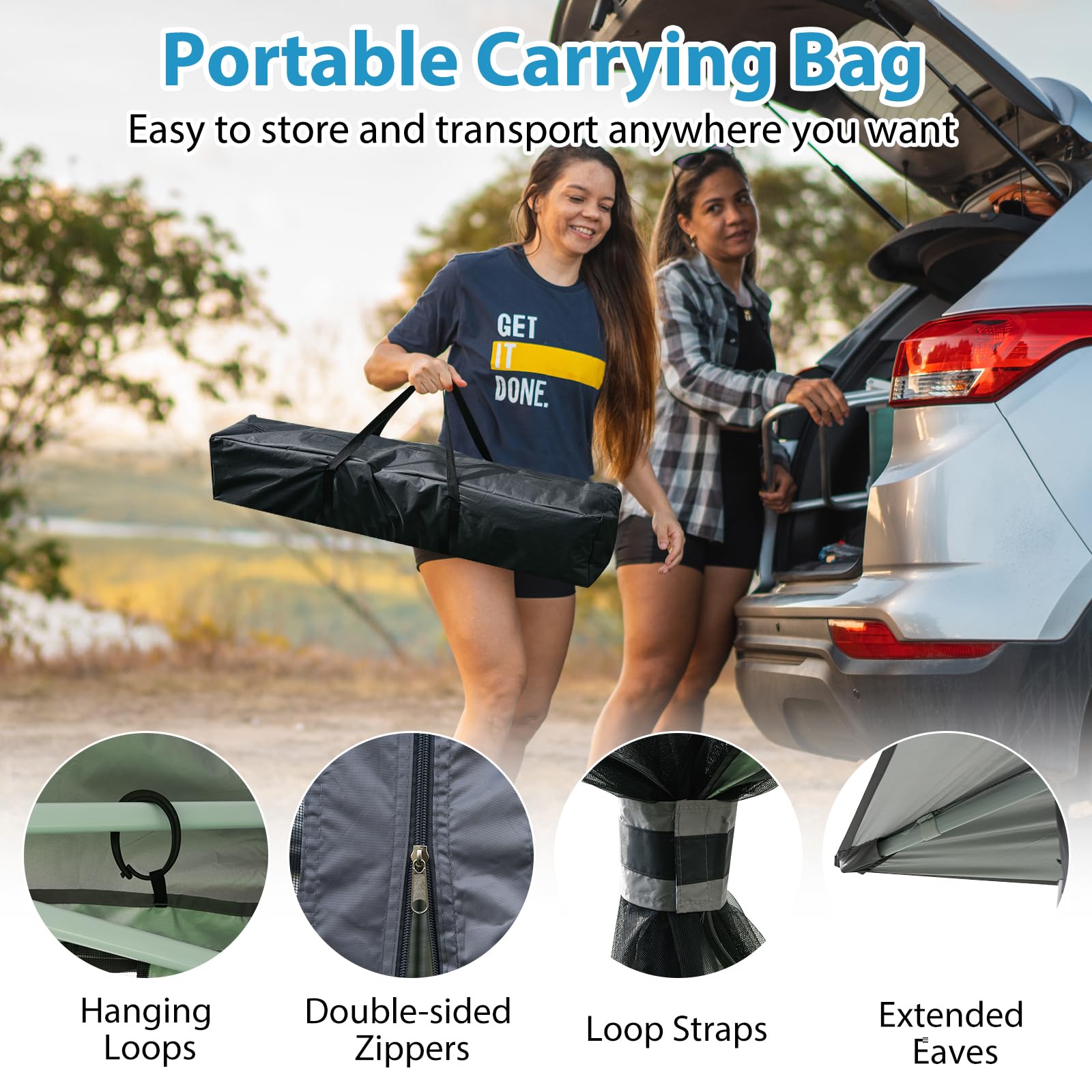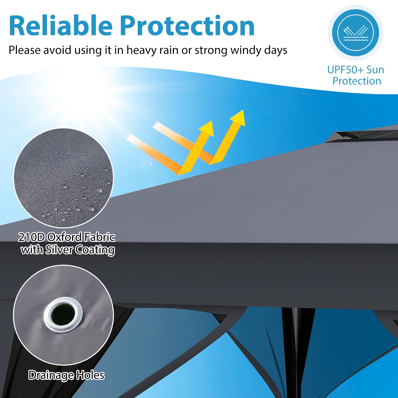 Our 11 x 11 ft pop up canopy tent features extended eaves for added sunshade and 3 adjustable height positions for different preferences, ideal for hosting a variety of events from beach parties to backyard barbecues. For enhanced comfort, it includes 4 breathable mesh sidewalls and a vented top with mesh netting for ventilation while keeping "unwanted guests" away. Thanks to its hassle-free pop-up structure and convenient pinch-free push buttons, setting up and taking down this shelter is breeze, and there is an included carrying bag for storage when not in use. Crafted from a 210D oxford canopy with silver coating, it offers reliable protection from outdoor elements (Please note: It serves as a temporary shelter, please fold it in severe weather conditions to prolong its service life). We also provide 8 metal stakes and 4 wind ropes to ensure it stands firm even on breezy days. Whether it's for a commercial event or a casual family outing, our easy-setup shelter can be a perfect choice!