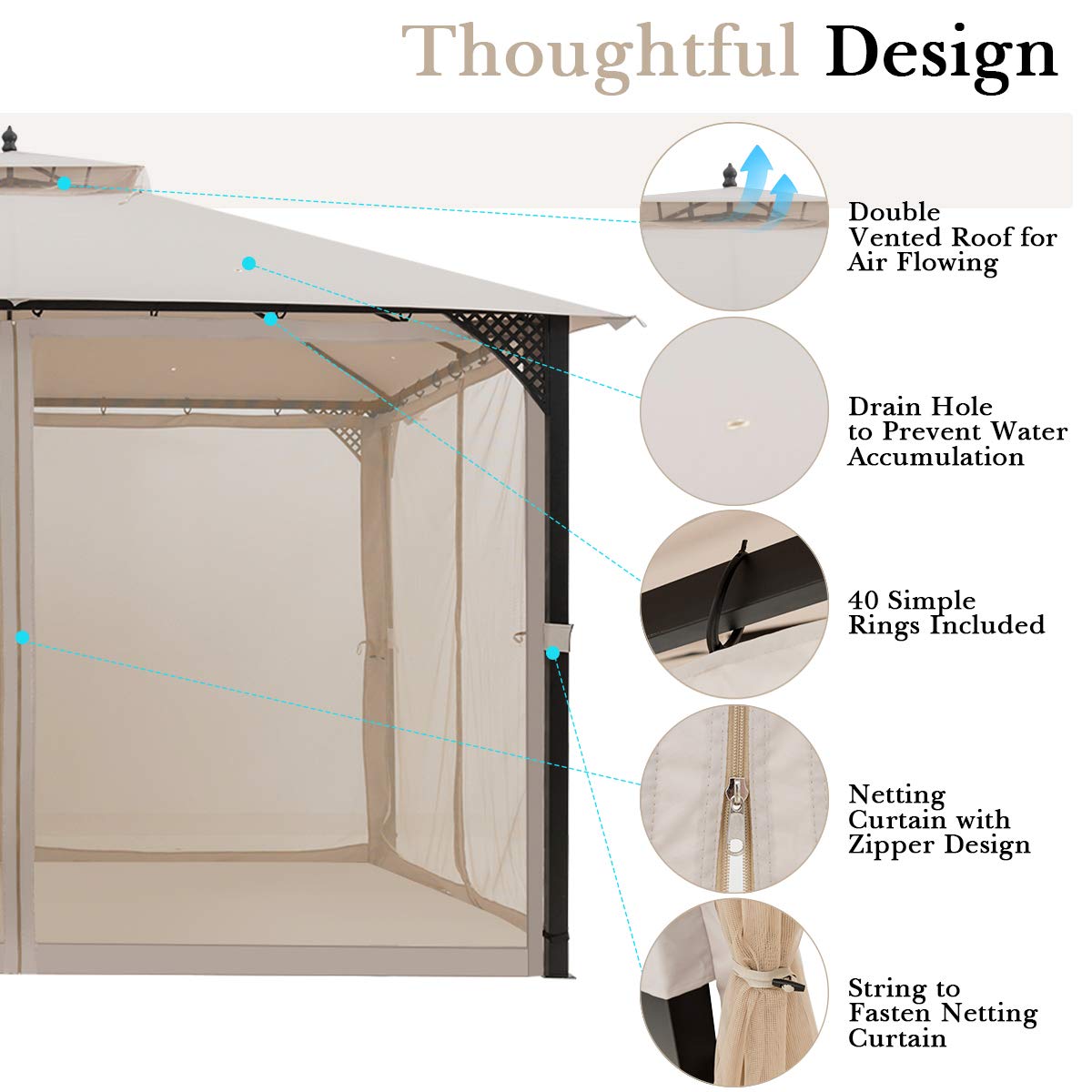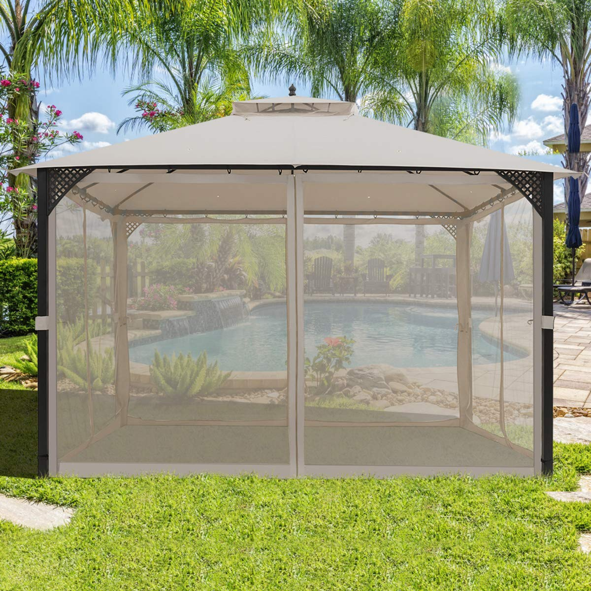 - Practical Netting Curtain: Featuring 4 high-quality netting sidewalls, the gazebo can bring a cooler and more comfortable experience in summer. After the zipper is closed, it can keep you away from outside interference and add more privacy to bring you convenience and enjoyment with your family or friends. Of course, it can also be tied up to enjoy a spacious open space.