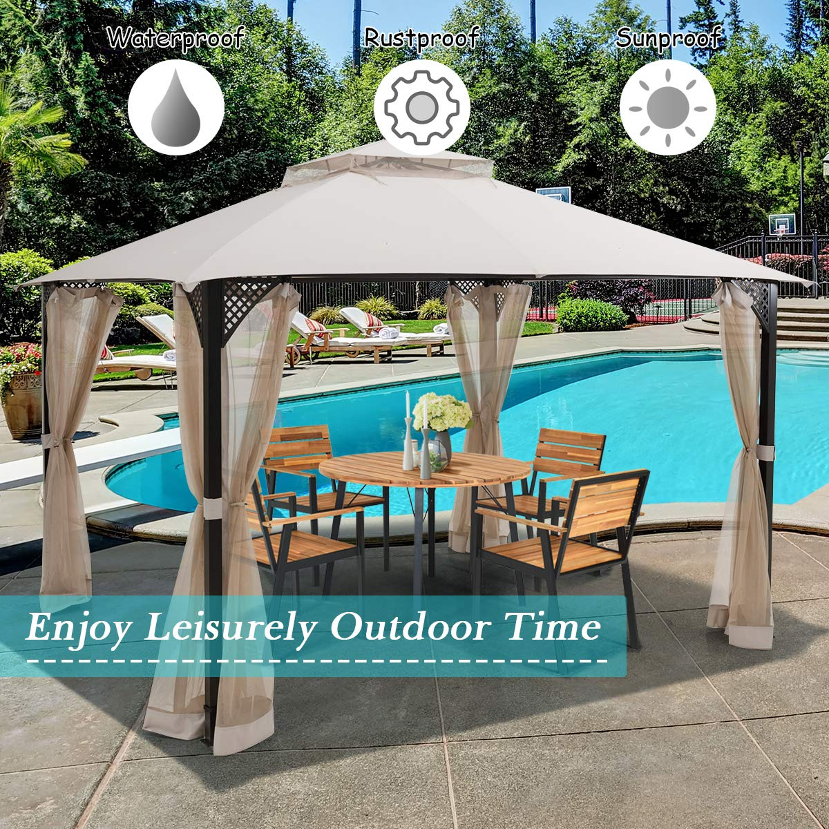 - Double-Vented Roof & Large Shade Area: This patio gazebo has a double-vented roof with top decoration. The dual-tiered top design can provide ample airflow to ensure good air circulation reduces wind stress and keep cool on hot days. What's more, the 12' x 10' canopy offers a wide range of space to protect you and your friends or family from sun and rain.