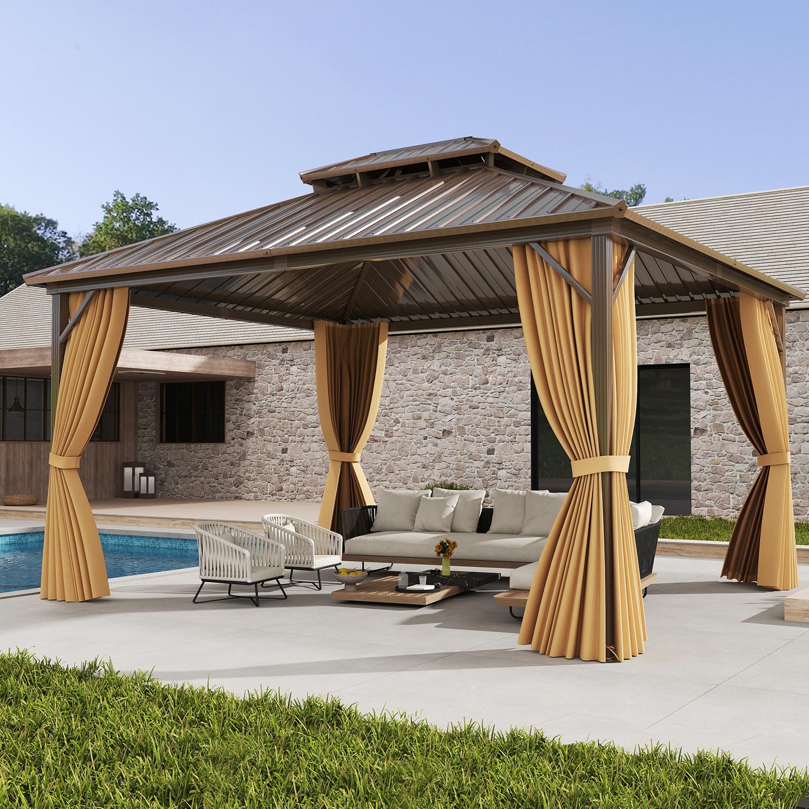 Experience the perfect outdoor retreat with our 14 x 12 FT gazebo. It boasts a large capacity and a double roof design, providing ample shade and shelter from rain and sun. The metal roof and anti-deform metal plates ensure durability, while the rustproof aluminum columns and beams offer stability. Each leg has 4 ground nails for extra support. Besides, the gazebo comes with practical curtains and netting. Use the waterproof polyester fabric curtains and mesh netting to create a 360-degree view, a breathable mesh curtain, or a fully enclosed space as needed. Its heavy-duty structure and convenient roof hooks add to its functionality. The U-shaped and J-shaped hooks allow for easy hanging of a ceiling fan and lamps. Hence, this gazebo is a versatile and comfortable choice for your outdoor activities.