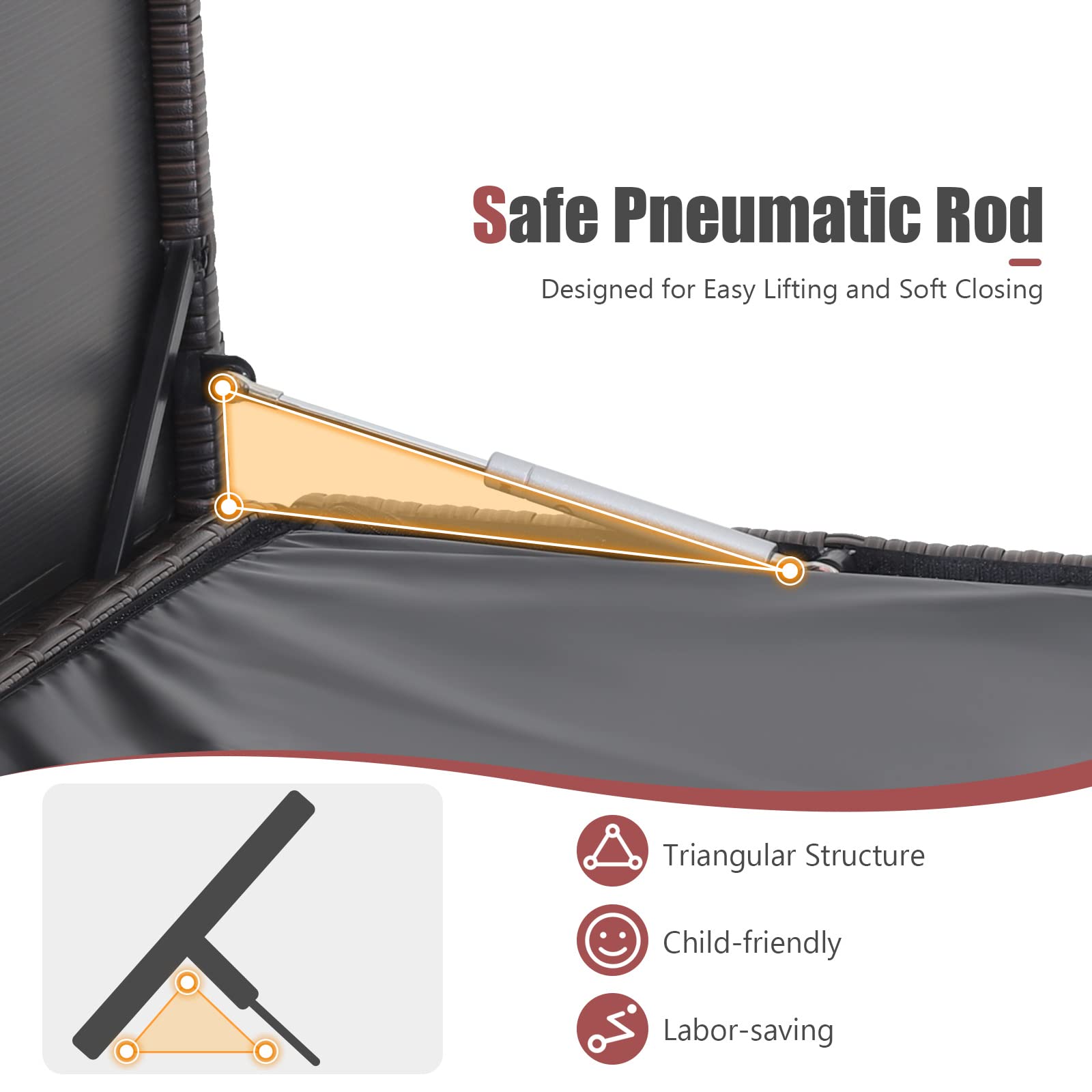 After simple assembly, this outdoor storage box can be moved wherever you want thanks to the cut-out handles and universal wheels. After that, you can open the lid with labor-saving pneumatic rods. Then, the 175-gallon capacity can't wait to show you how big the inner space is. It can accommodate up to 10 seat cushions (25" x 27" x 5" thickness) and 12 back cushions (25"x 27"x 4" thickness). Zipper up the waterproof liner and cover the lid. The storage has been done. Just leave this deck box outdoors. The colorfast PE wicker will take care of it