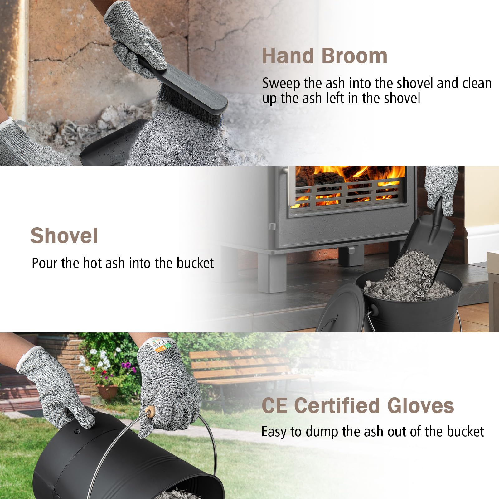 Built from heavy-duty metal that resists warping, rust, and scratches, the bucket safely holds hot ashes or burning charcoals, while its lid locks in dust during transport. The raised base keeps heat away from the flooring, and the wooden handle ensures a secure grip. Plus, it includes a set of fireplace tools: a shovel for scooping debris and ashes, a brush for cleaning the shovel, and a pair of cut-resistant gloves to protect your hands during use. Whether you're tidying up after a cozy indoor fireplace night or hosting a weekend BBQ grill, our versatile ash bucket is sure to help!