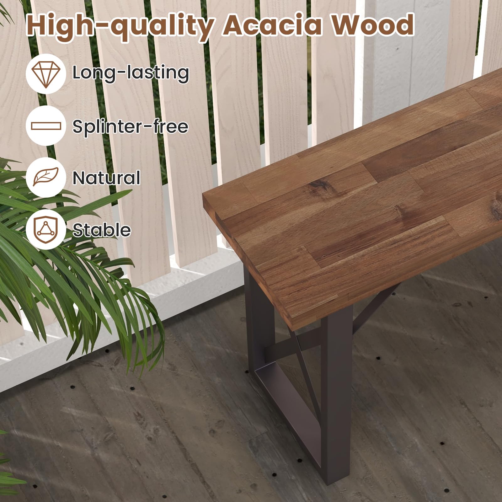 - Wide Application: The natural wood and sleek metal combine to create a modern yet timeless piece that suits various decoration styles from rustic to contemporary, making these patio benches suitable for your garden, porch or backyard.