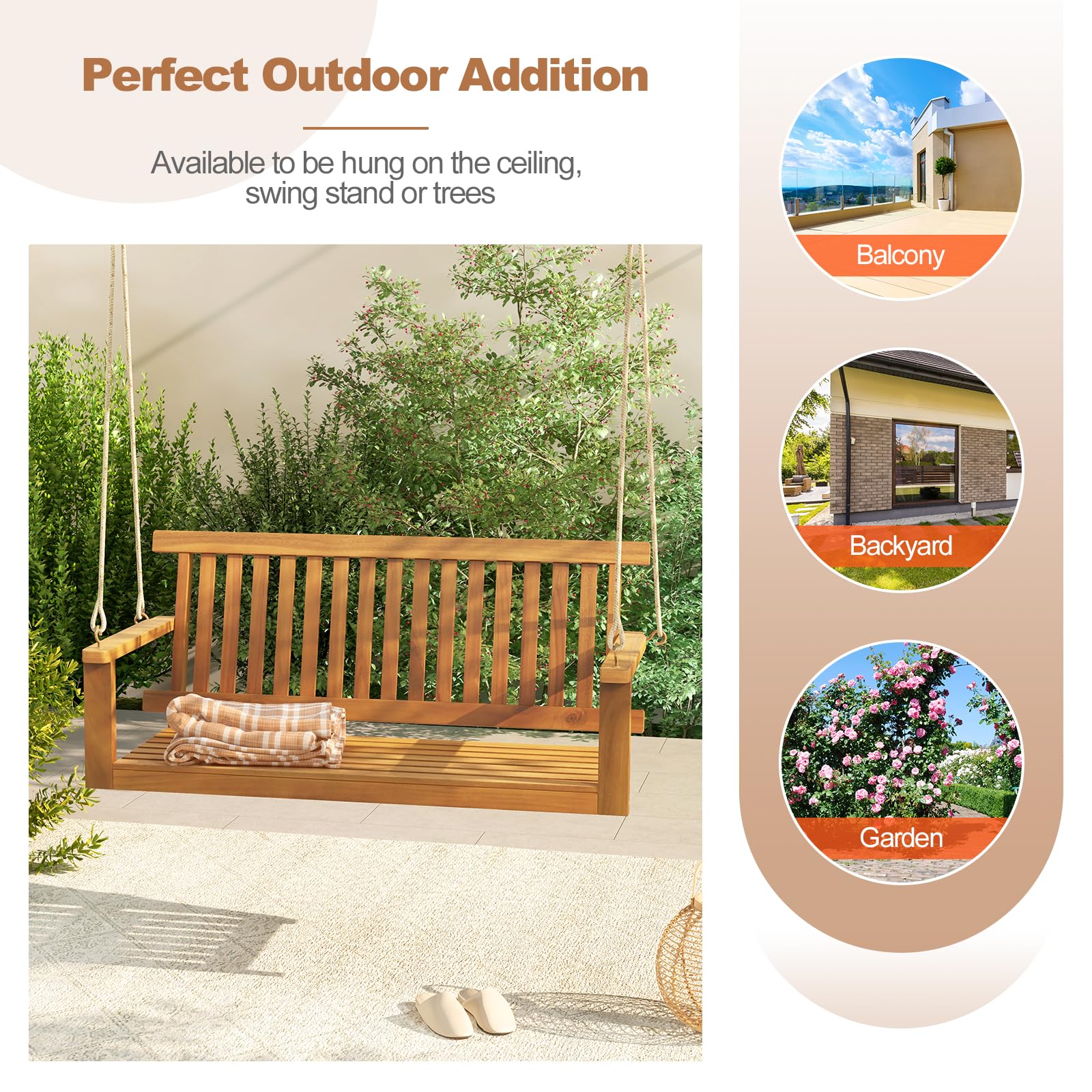 - Hang Anywhere You Want: With appealing appearance and high-level comfort, this patio swing will a perfect outdoor addition. Whether in the balcony, backyard, garden or others, you can always enjoy relaxing and ease with this swing.