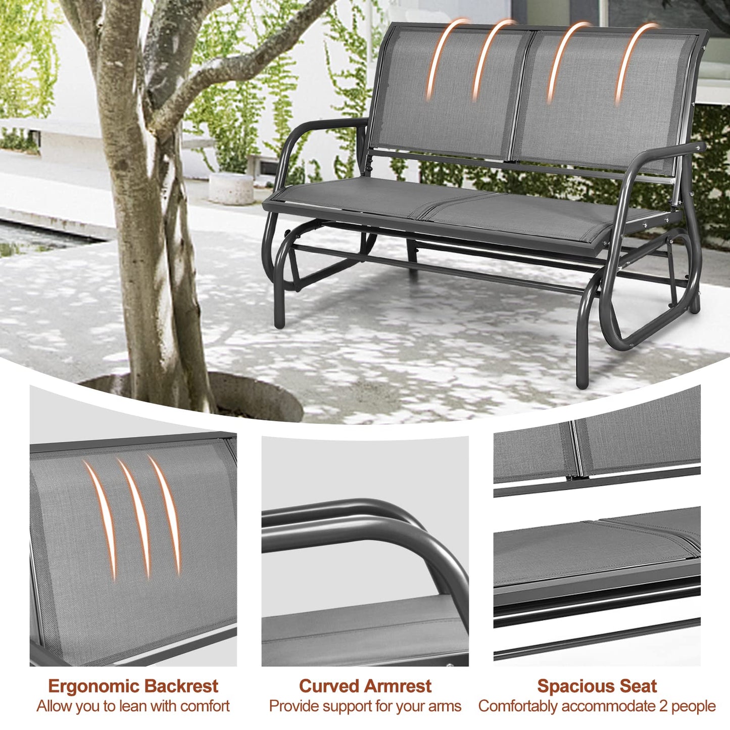 - Reinforced Metal Frame: Constructed of heavy-duty metal pipe, this glider chair supports up to 400 lbs while weighing only 34.5 lbs. With a black finish, the chair frame is rust-resistant, wear-resistant, and weatherproof, ensuring long service life. And four-legged support adds stability to use.