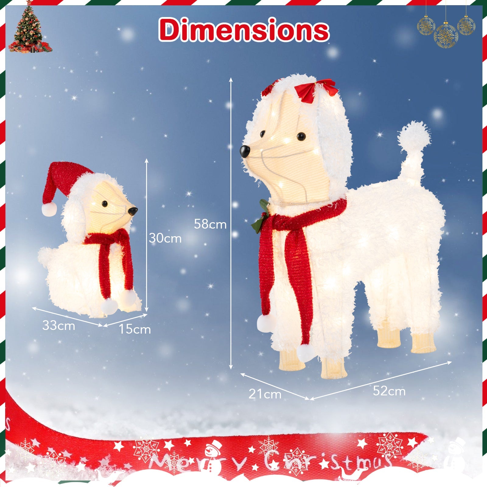 - Holiday Sparkle with LED Lights: Boasting 60 bright LED lights, the 2-piece Christmas dogs will add a radiant festive touch to your holiday display. It is easy to illuminate these dog decorations using the included power adapter.
