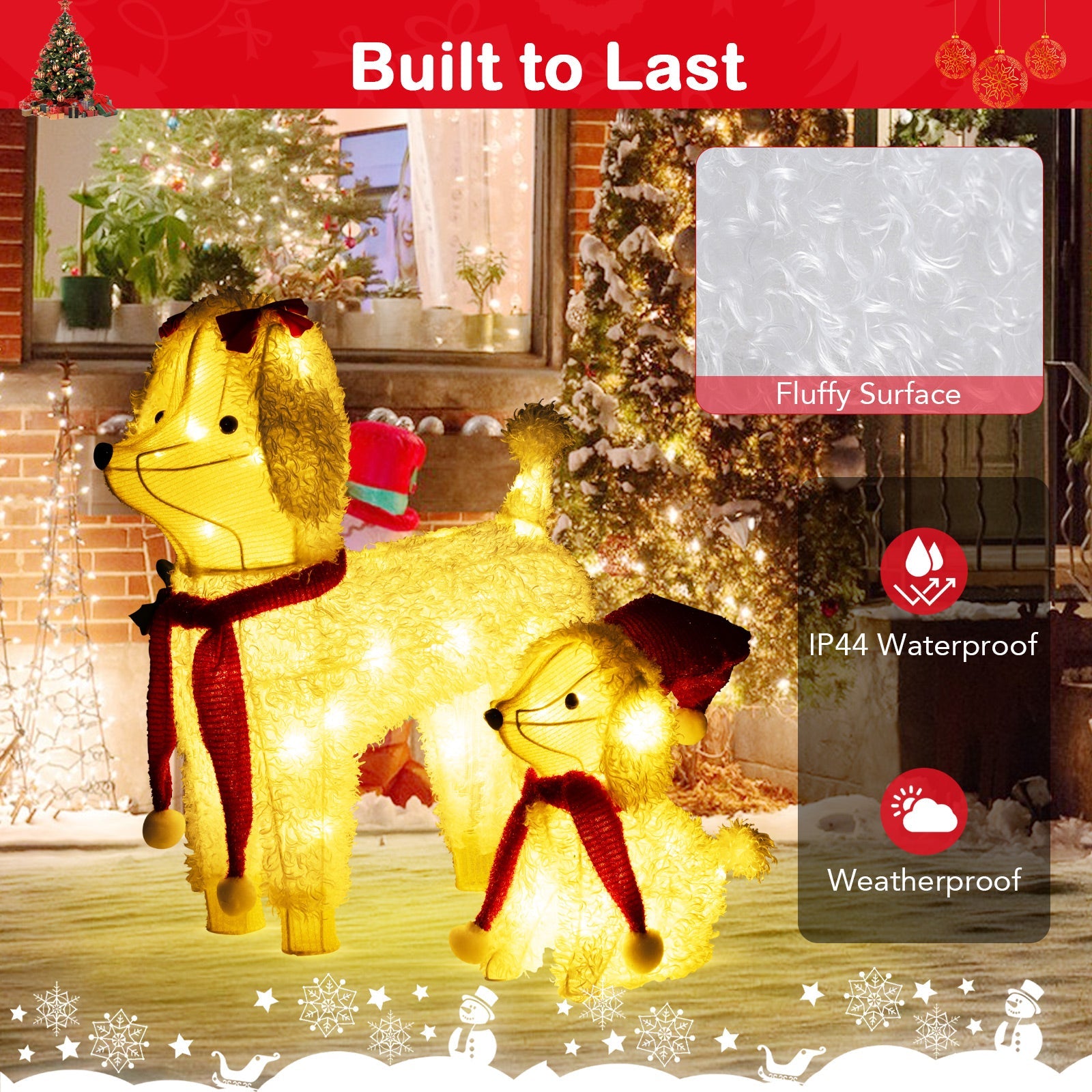 - Weather-Resistant Construction: These Christmas pre-lit dogs are designed with an IP44 waterproof rating, ensuring they can withstand the test of time. Whether it is snow, rain, or wind, these poodle dogs will maintain their festive charm.