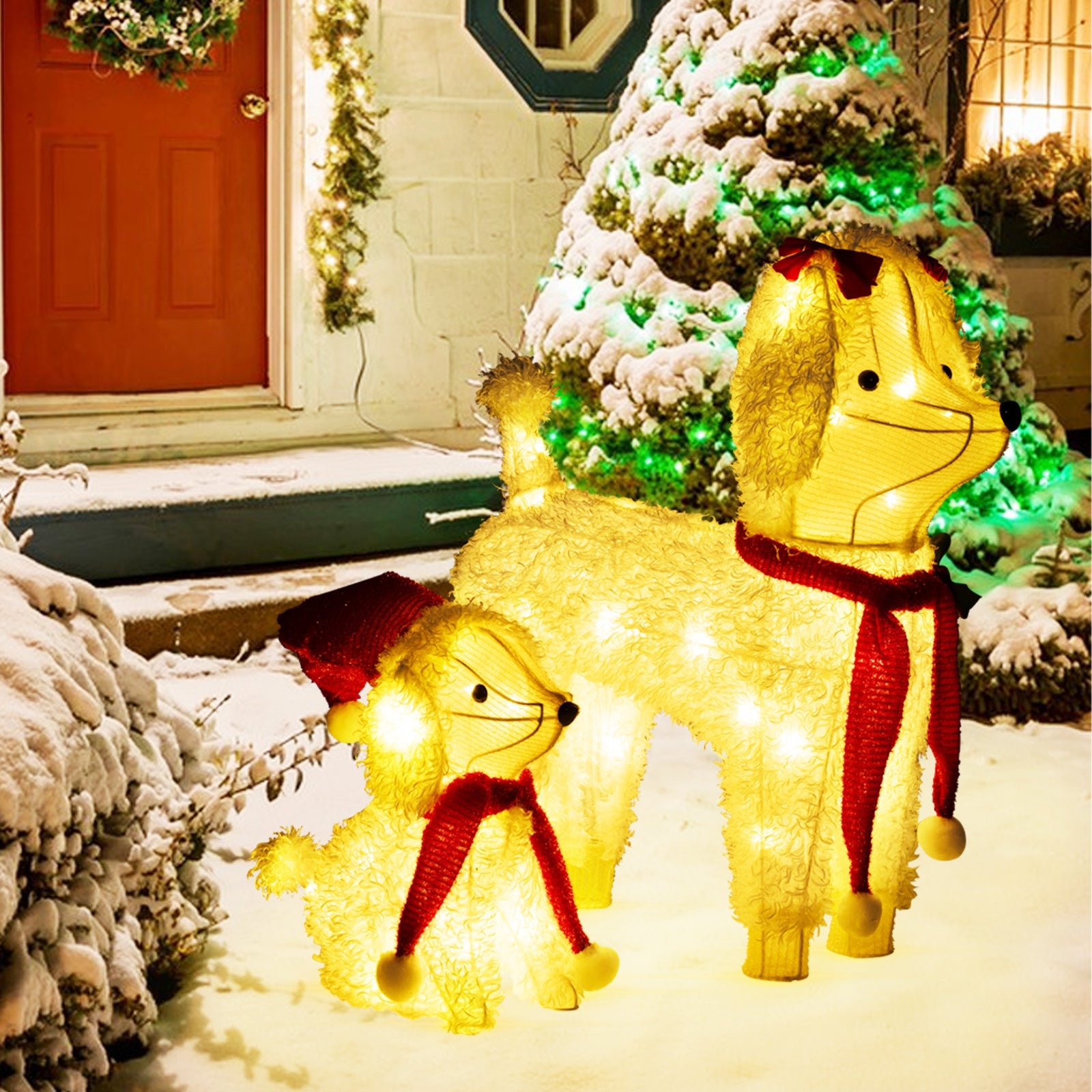 These pre-lit Christmas poodles exude holiday joy with their beautiful built-in LED lights. Crafted with a weather-resistant design, complete with an IP44 waterproof rating, these lighted dog decorations are able to withstand various weather conditions. Setting them up is a breeze thanks to the included durable zip ties and metal ground stakes. Featuring a mother dog and her adorable puppy sporting red scarves, these endearing dogs will create a heartwarming holiday ambiance in your indoor or outdoor spaces. Whether displayed in your front yard, on your porch, or in your living room, this pre-lit dog family set will evoke a magical winter wonderland for you to enjoy.