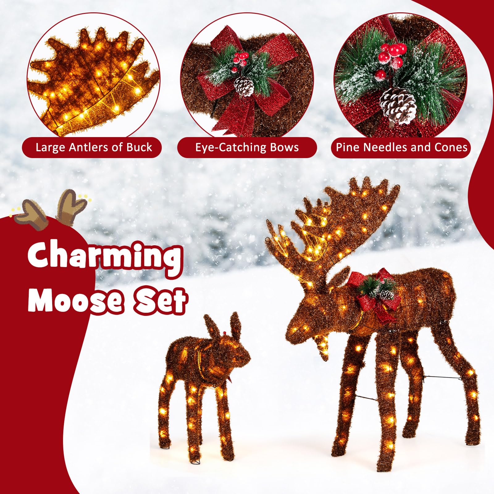 - Charming Moose Set: Bring warmth and festive charm to your holiday decorations with this 2-piece Christmas moose family set. The large antlers of buck and eye-catching bows with pine needles and cones make the moose set the highlight of your yard or home.