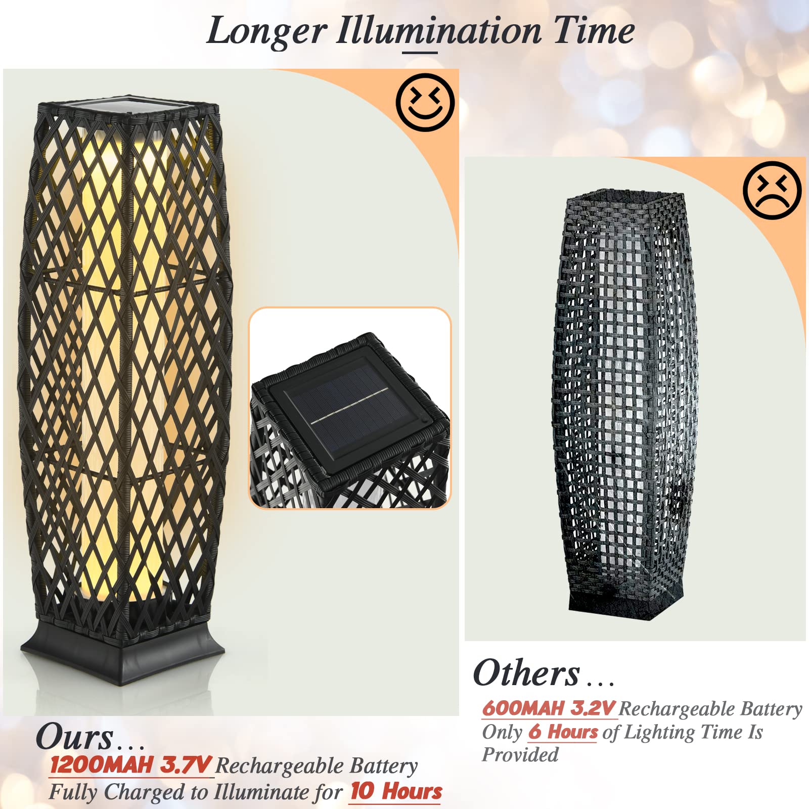 - [Solar-powered Floor Lamp]: These outdoor lanterns are powered by solar energy with no wiring required that not only saves your energy cost but is convenient for outdoor use. After charging 8H-10H in sunlight, these rattan floor lamps will work up to 8H-10H at night.