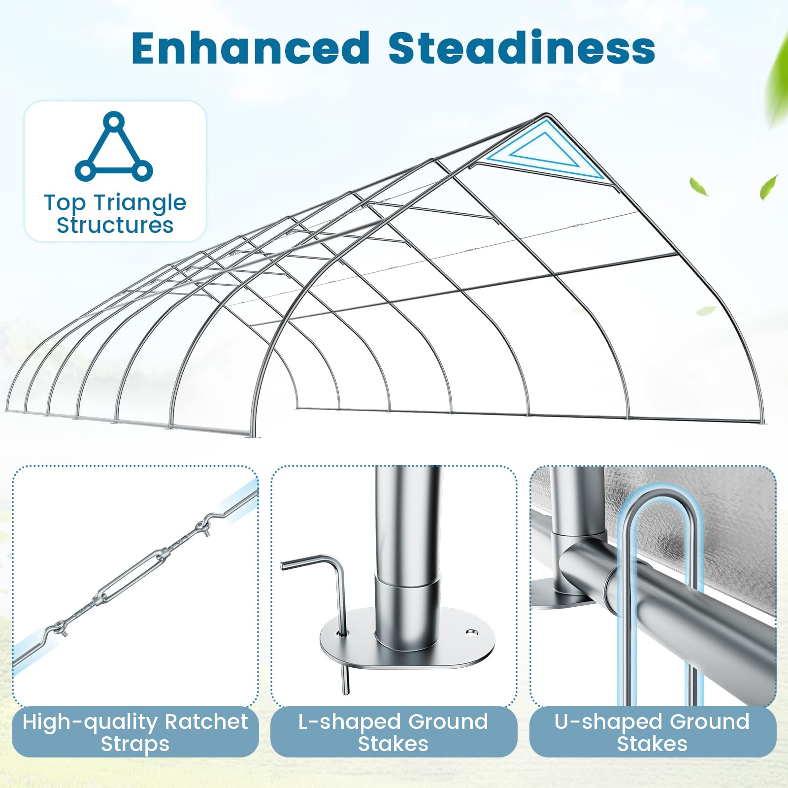 • Enhanced Steadiness: Equipped with L-shaped ground stakes and U-shaped ground stakes, this event party tent can stand stably for your peace of mind. Furthermore, the top triangle structures, high-quality ratchet straps, elastic ball straps, and hook and loop fasteners bring additional stability.
