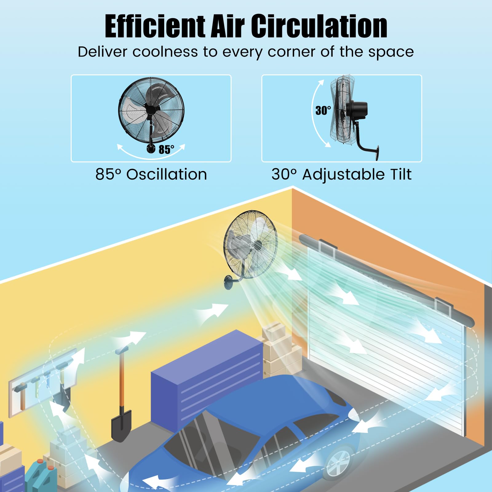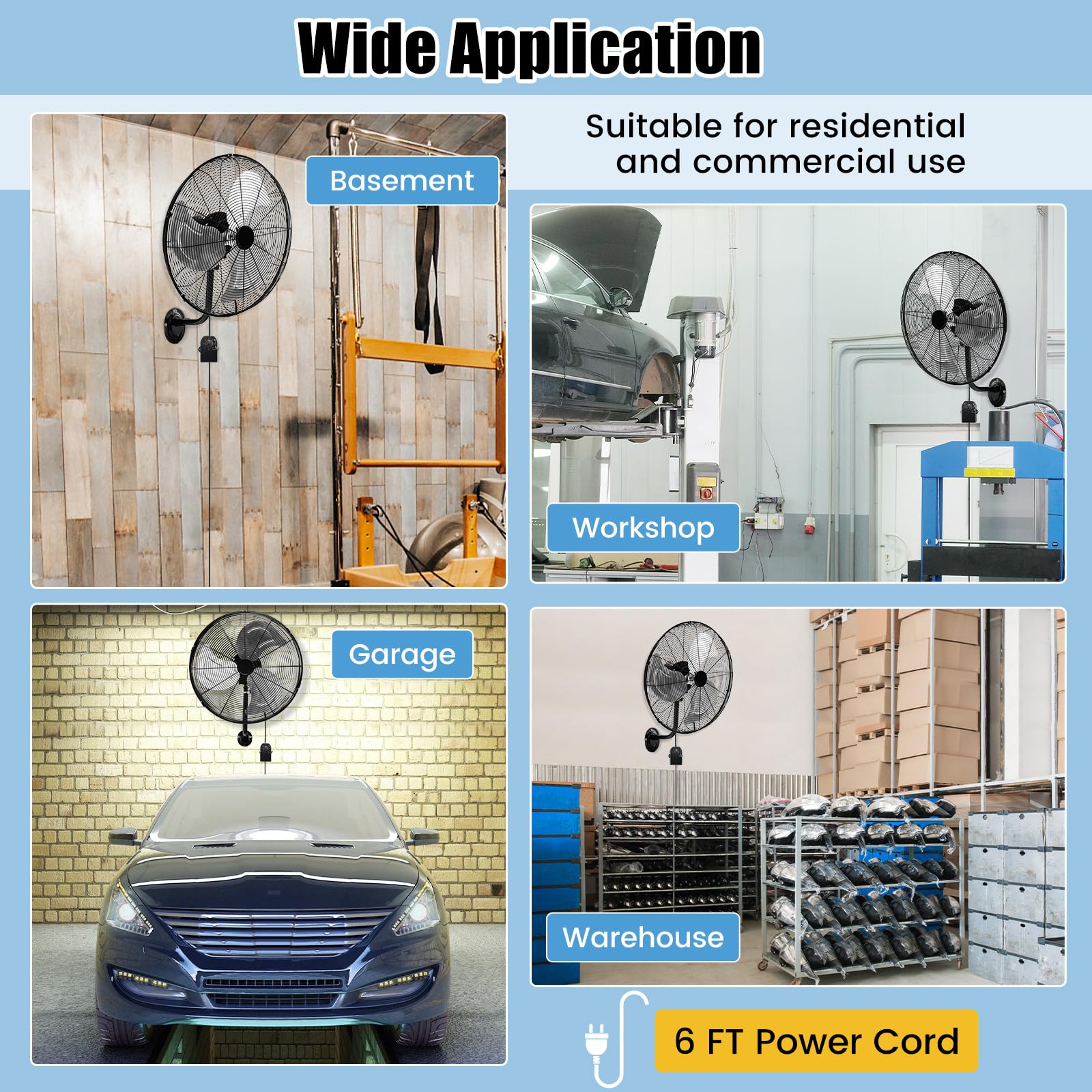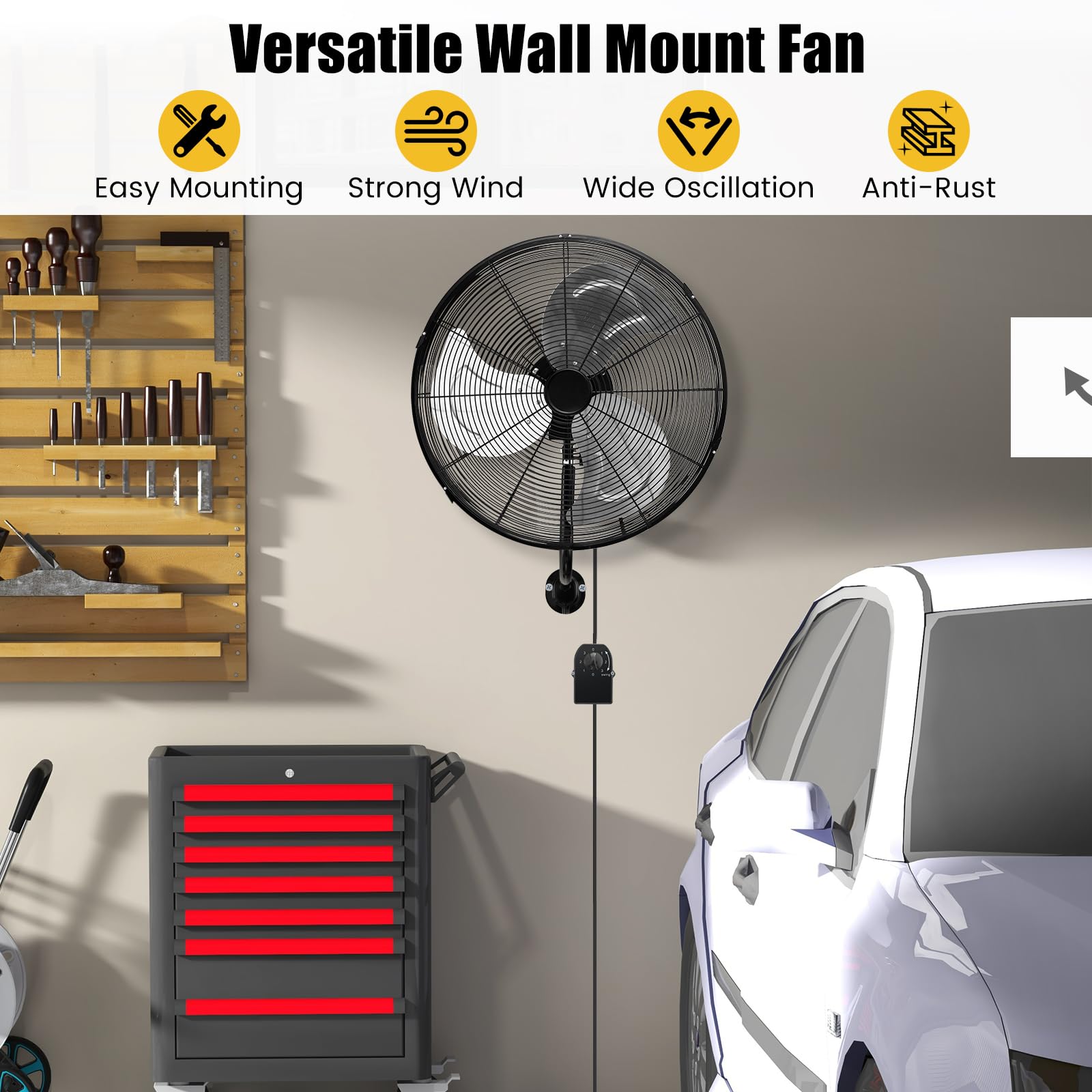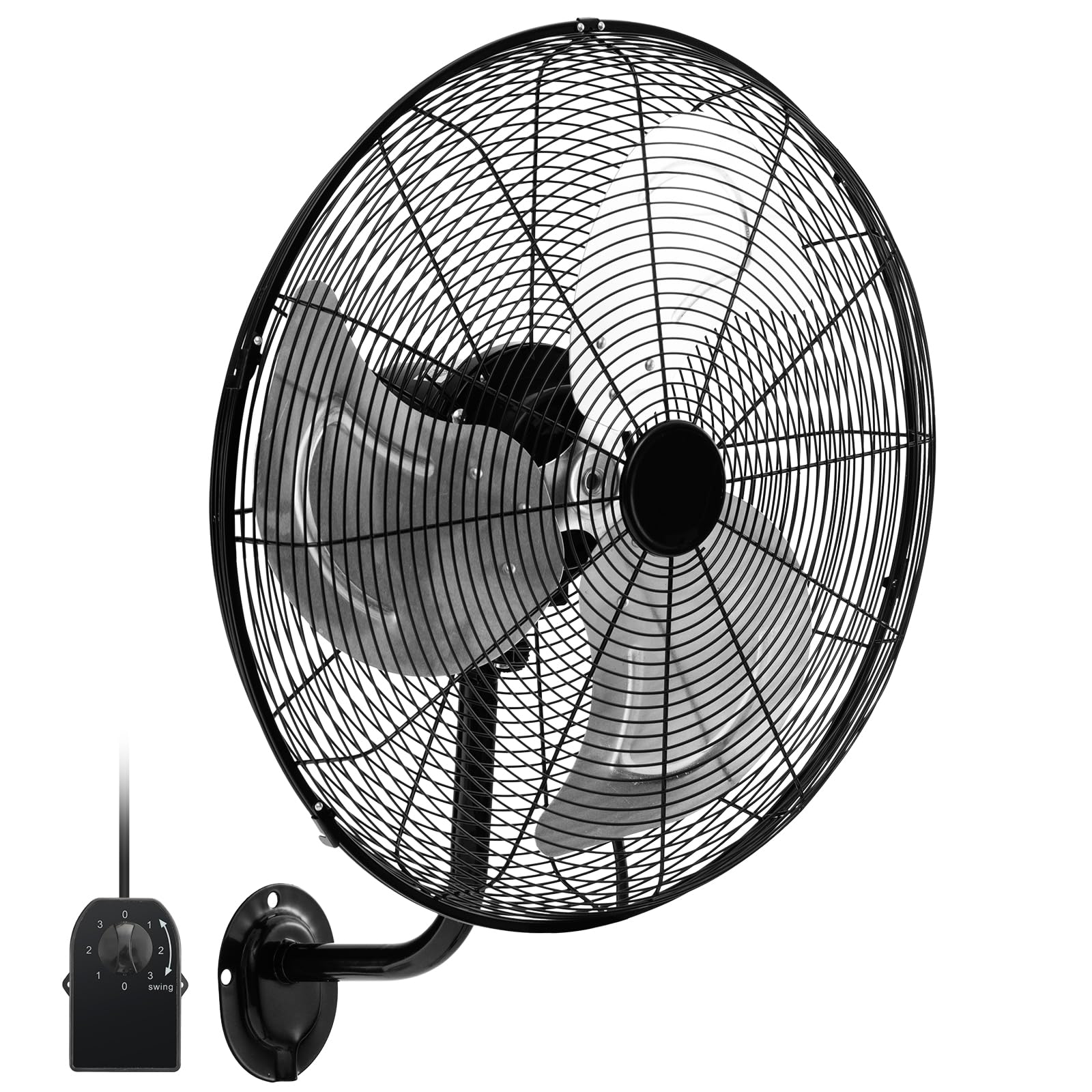 Equipped with powerful double ball-bearing motors and 3 aluminum blades, this ventilating fan provides strong wind and the fan speeds are adjustable for your different needs. This ventilating fan also features wide oscillation and its tilting head is adjustable too, ensuring wide air circulation and allowing you to find the desired wind direction. The wall-mounted design will save valuable ground space and the installation is easy with instructions and accessories. Made of metal housing and aluminum blades, the wall mount fan is durable for long service life. Moreover, this wall mount fan is suitable for both household and commercial use, such as patio, garage, basement, workshop, warehouse, and more.