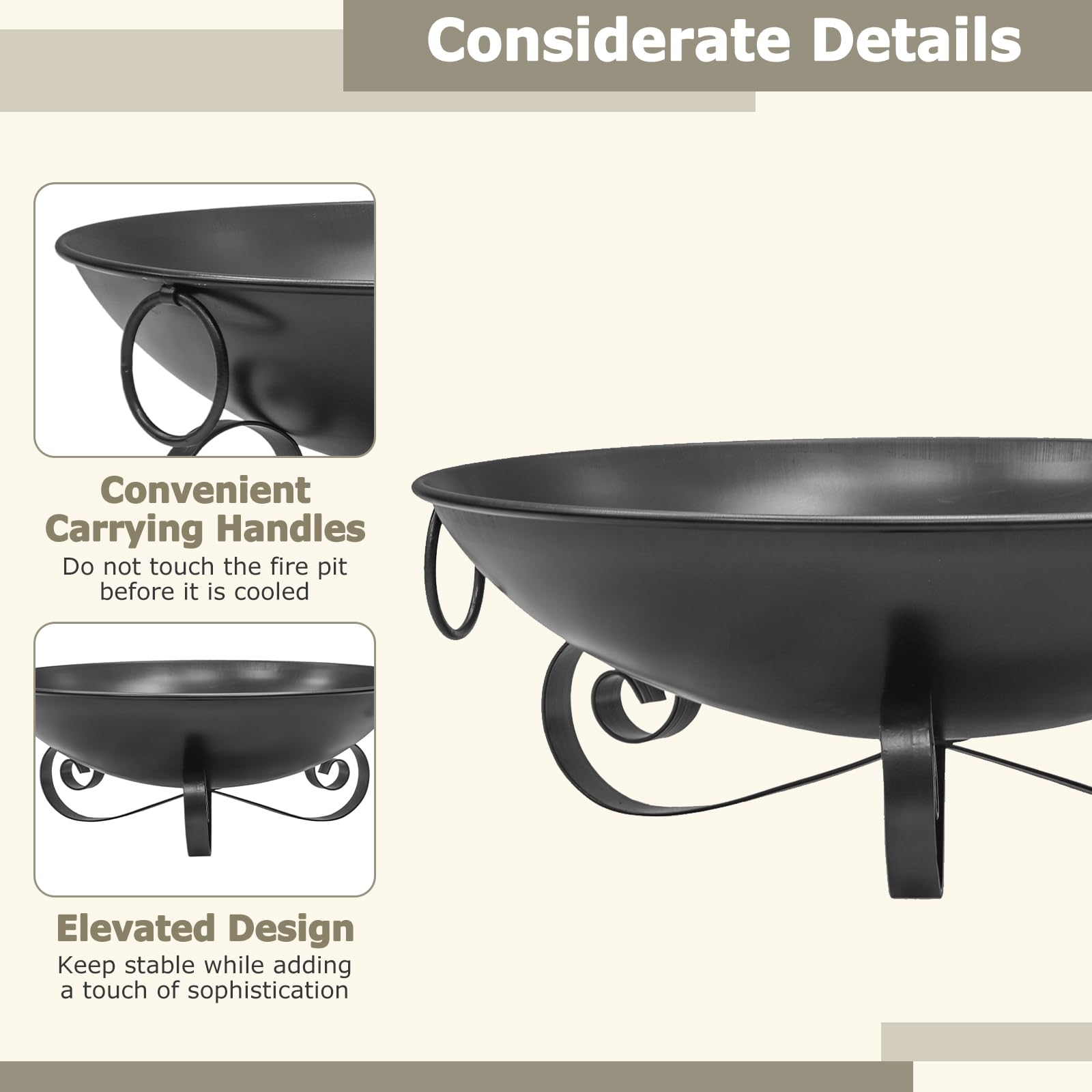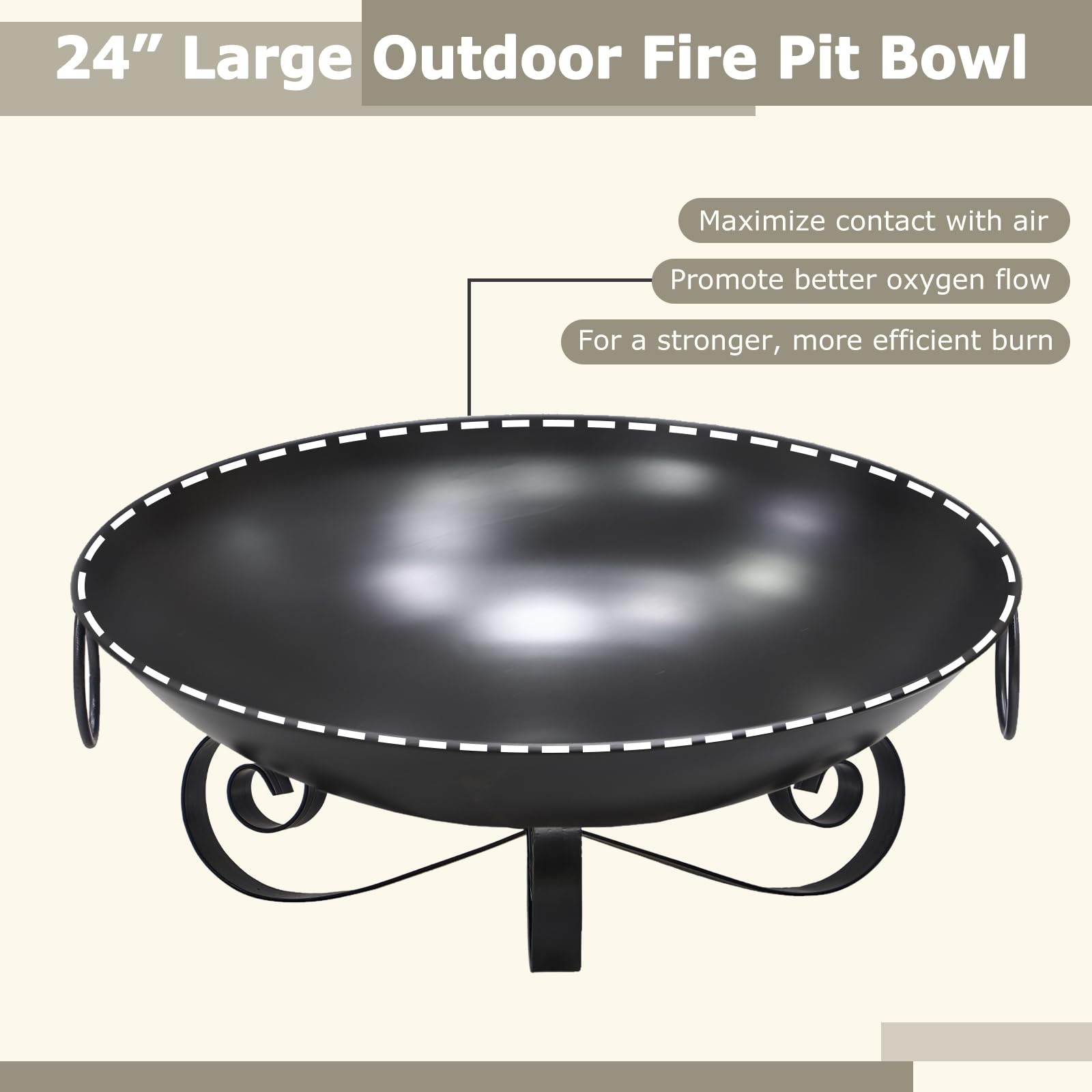 Our versatile outdoor fire pit measures 24" x 9" (Dia. x H), with an open design optimize airflow for a robust burn with less smoke, providing comfort for 4-5 people to gather and enjoy memorable evenings together. Built from sturdy metal with a high-temperature, rustproof finish, this wood burning fire pit bowl ensures lasting performance through every season while remaining beautiful and easy to maintain. The lightweight construction and convenient handles make it simple to take this portable firepit to camping trips or tailgate parties, giving you warmth and ambiance wherever you roam.