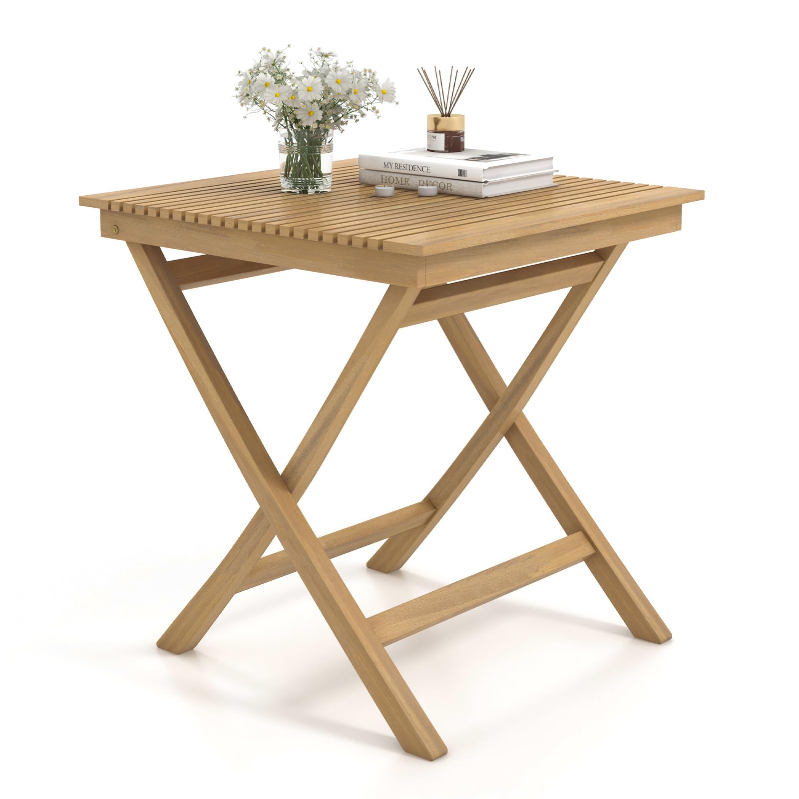 Tangkula 27.5 Inch Patio Bistro Table, Teak Wood Square Table with Slatted Tabletop