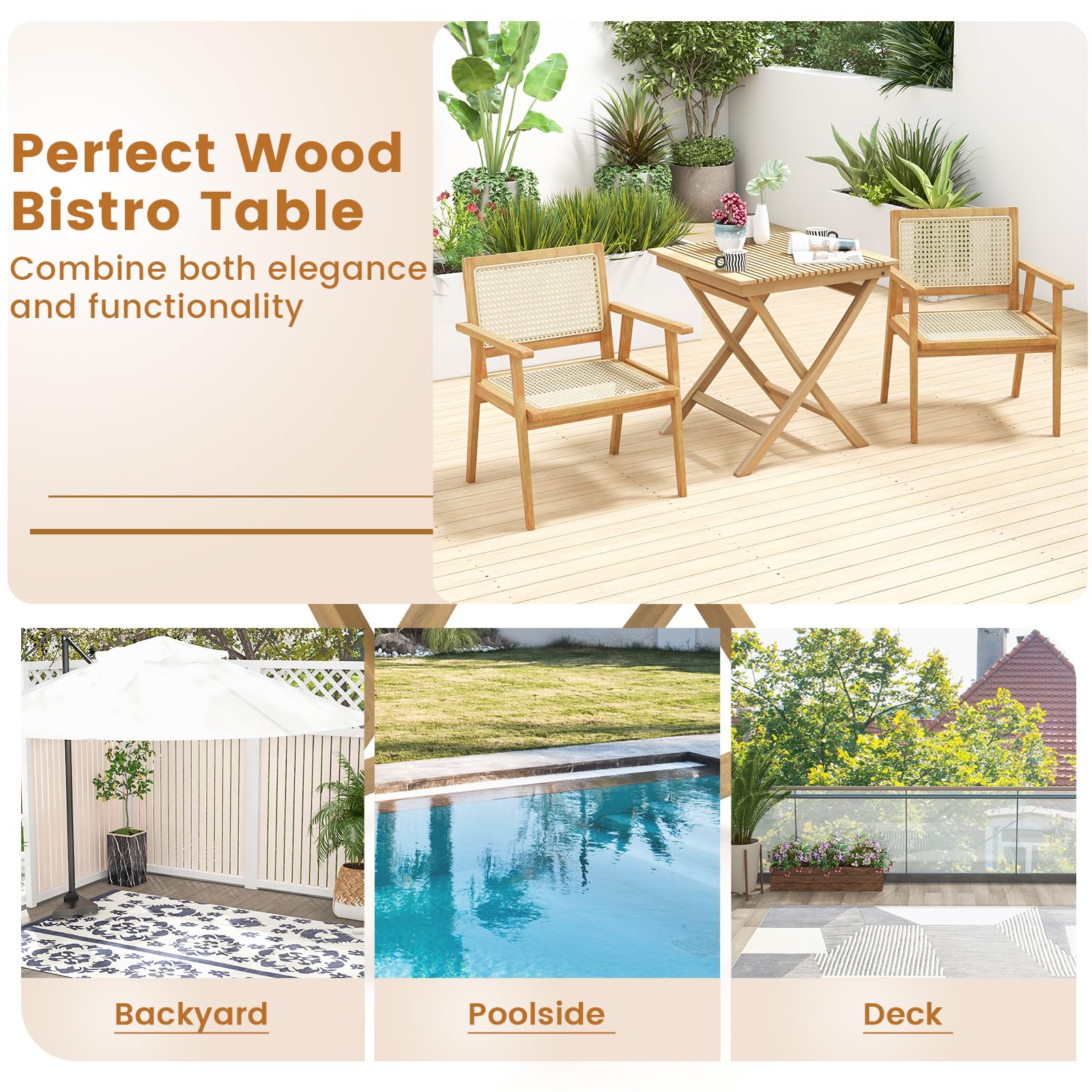 • Nice Patio Addition: Enjoy outdoor leisure time with this perfect wood bistro table which combines both elegance and functionality. It will be an ideal addition for backyard, poolside, deck and so on.