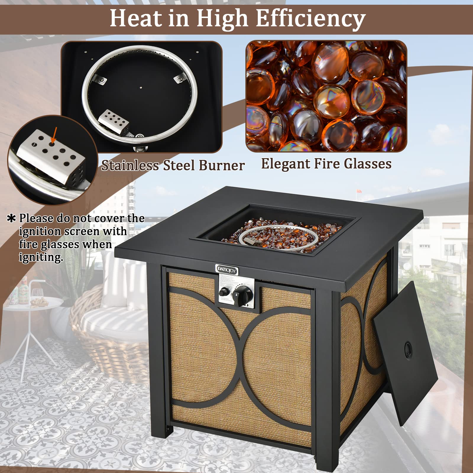 • Heat in High Efficiency: The stainless steel burner can withstand long-time burning and will produce 50,000 BTU heat output for endless warmness. Also, the elegant fire glasses make the dancing flame more attractive and appealing.