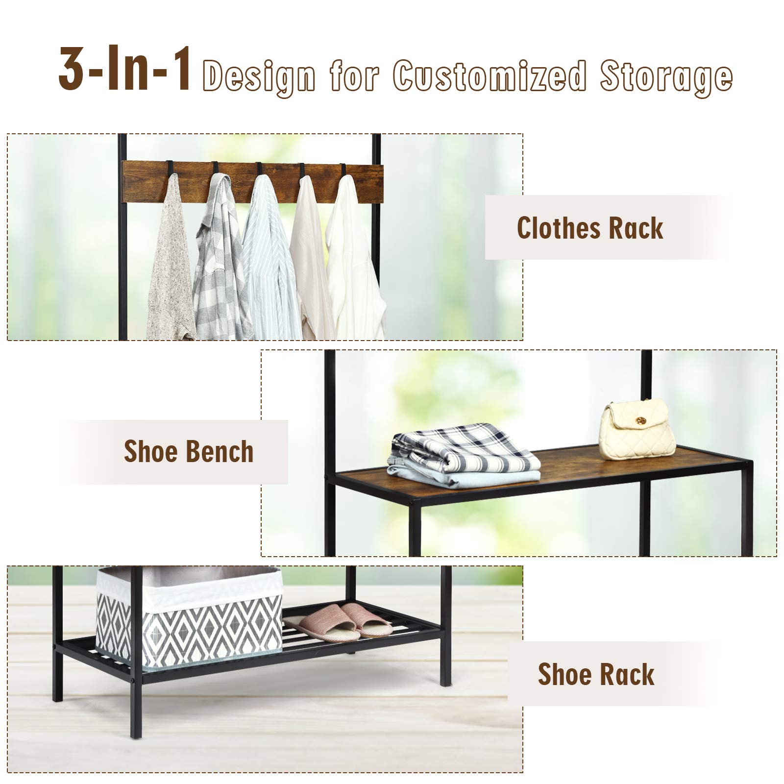 There is a fantastic 3-in-1 entryway hall tree for you to keep the house tidier! Our entryway storage organizer features the perfect combination of coat rack and shoe bench, providing you with a large storage space for clothes, hats, shoes, bags or other daily necessities. Being placed at the entryway, it can keep everything you need at hand when you are in a hurry to go out. Stable metal frame and durable MDF material also ensure high stability and long life span. And it will look good when you place it in your home.