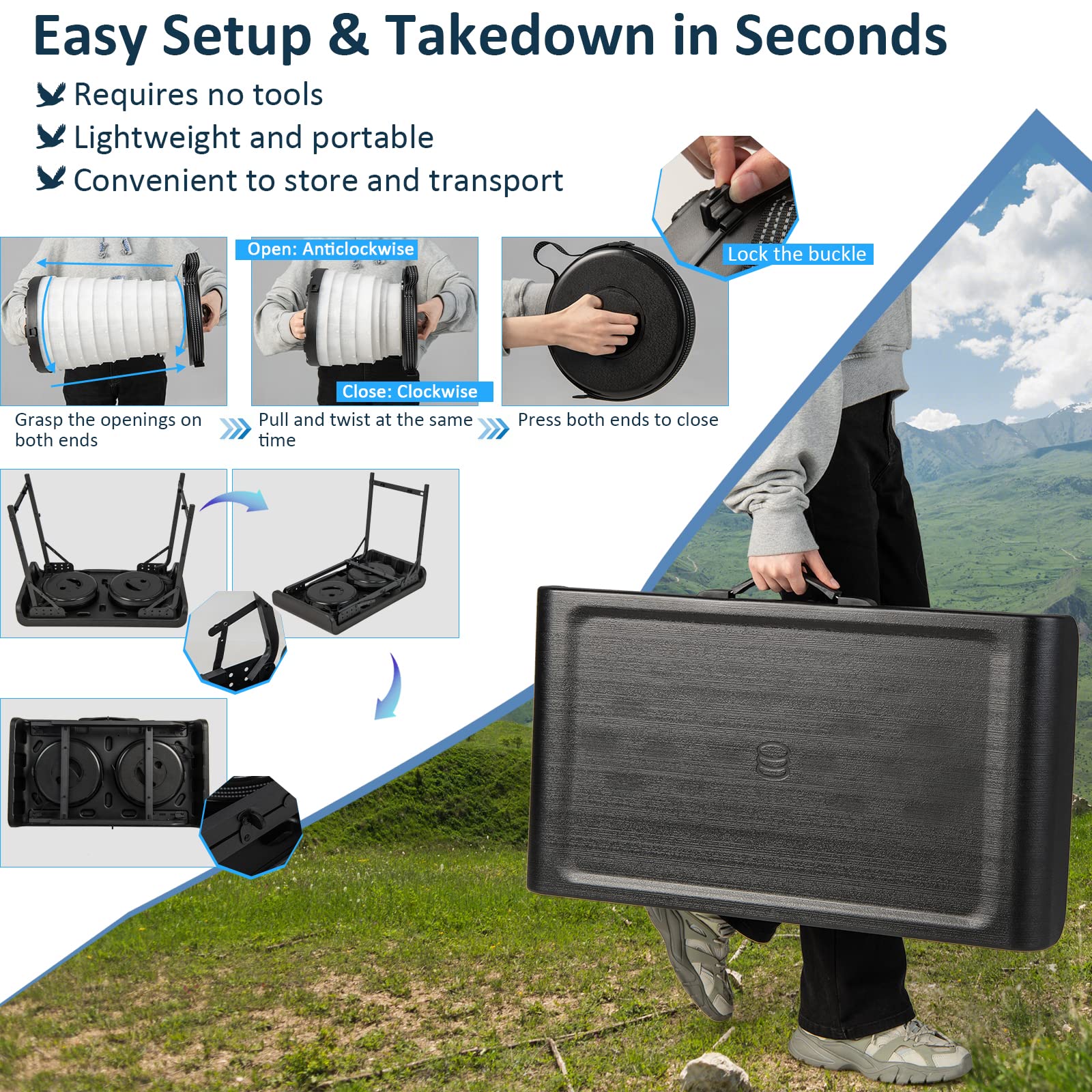Our 3-piece folding table chair set includes a camping table and 2 retractable stools, and it can be folded into a flat size for easy transportation, which is suitable for various outdoor activities, such as camping with friends, family beach time, fishing, BBQ or picnic at night, and more. Most importantly, it is equipped with LED stools that can emit lights of different colors in 3 modes, making your outdoor activities funnier. Furthermore, the stool can also easily be retracted, and all you need to do is grasp the openings on both ends, pull and twist at the same time (open: anticlockwise, close: clockwise), press both ends to close, and then lock the buckle. There exist 10-level adjustable seat heights for you to choose from. Besides, the stool adopts a unique annular sliding rail structure and the table is supported by a heavy-duty aluminum alloy frame, ensuring good sturdiness and a large loading capacity( each stool: 440 lbs, the table: 66 lbs).