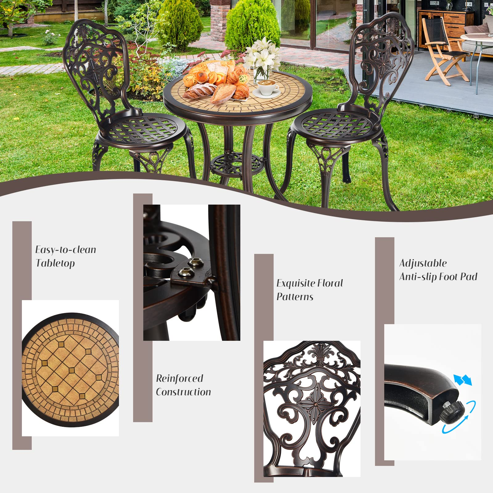 When you rest outdoors, the ergonomic backrest and seat allow your body to enjoy the sun in comfort. And the table's delicate and beautiful pattern design embellishes your mood. All-weather and rust-resistant cast aluminum ensures it can be used all year round. Moreover, the adjustable anti-slip foot pads of this patio bistro table set will not scratch the floor while keeping it balanced. In addition, the spacious and non-hollow tabletop allows you to place dinner plates and vases without worrying about spills and leaks.