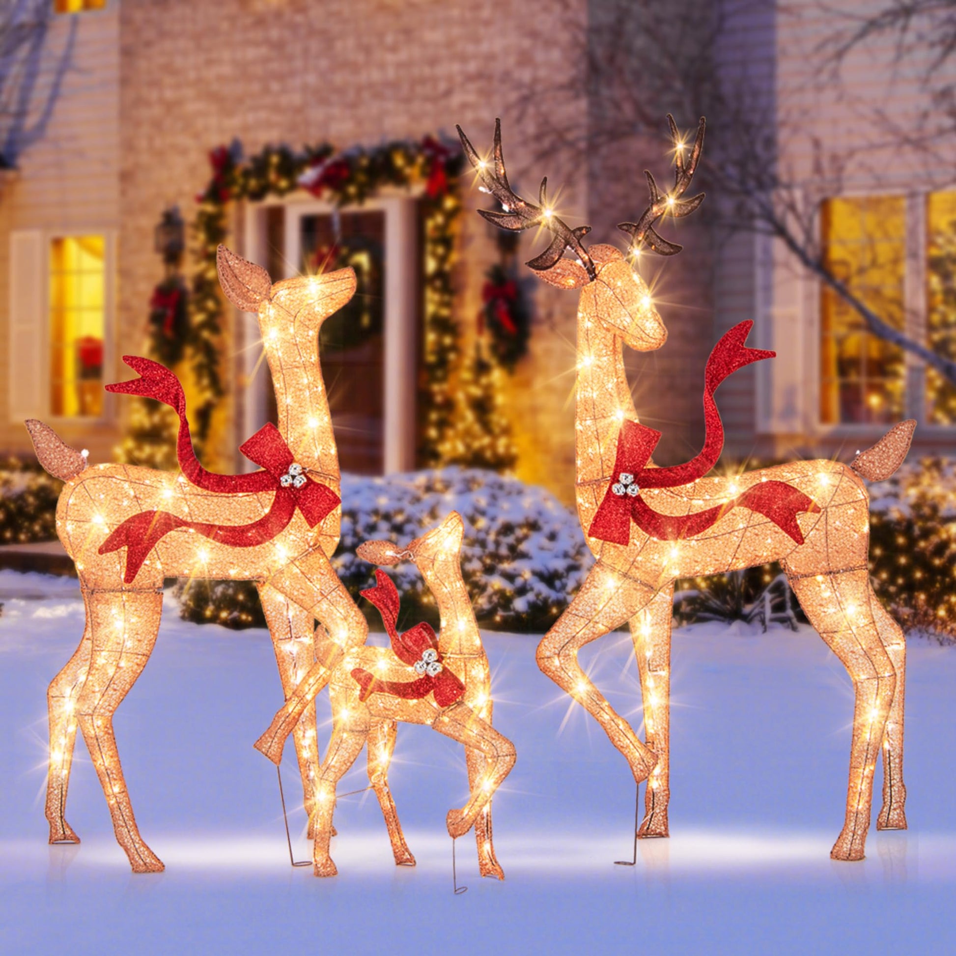 Transform your home into a winter wonderland with this 3-piece pre-lit Christmas deer family set, featuring a 6.1 ft buck, a 5 ft doe, and an adorable 2.9 ft fawn.