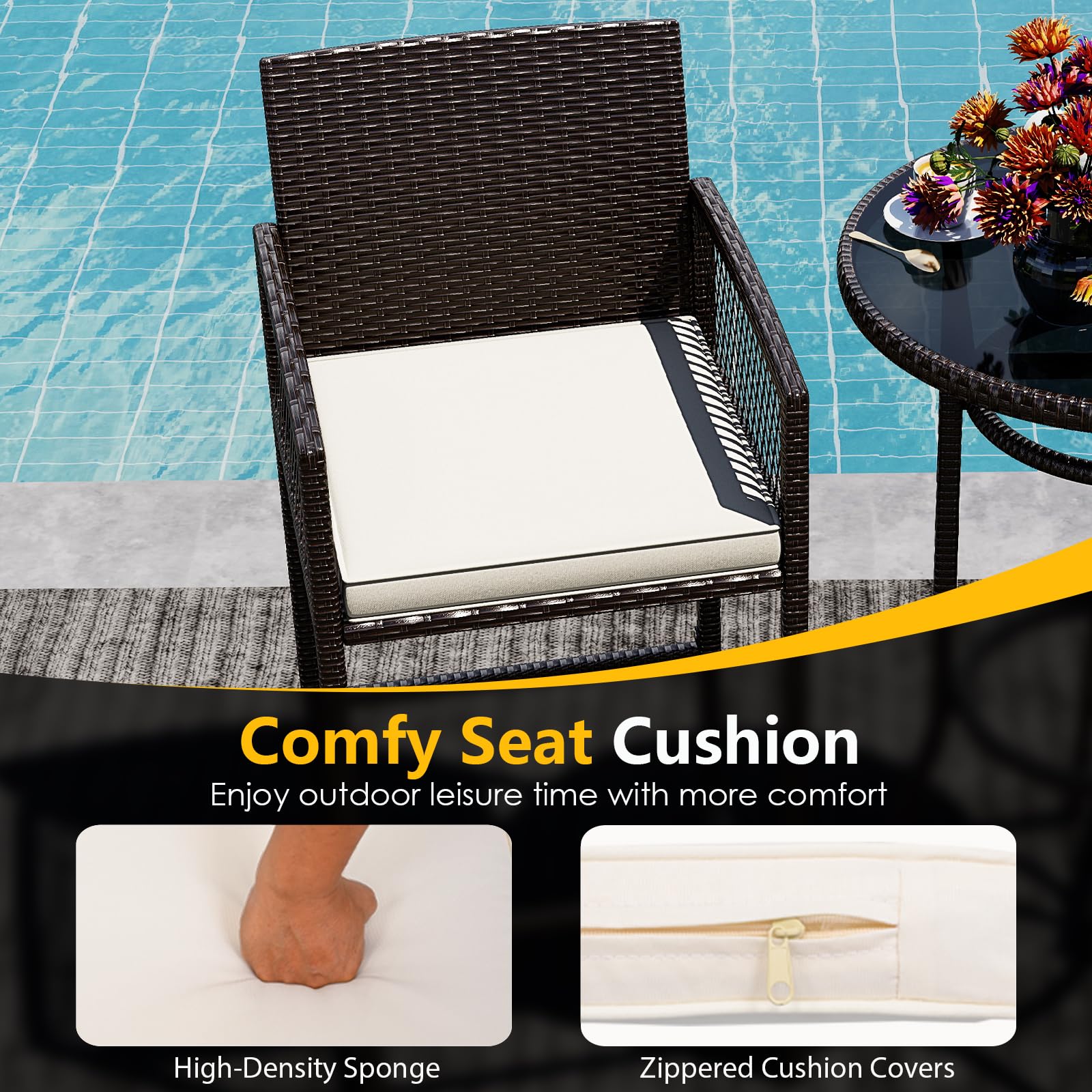 Both the bar chairs and table feature hand-woven PE rattan that is both sunproof and aesthetically pleasing. The robust metal frames ensure durability and stability, while the stylish table boasts a tempered glass top for easy maintenance and safety. Complemented by high-density sponge cushions on each stool, this outdoor set offers unrivaled comfort and style, perfect for enhancing leisure time in your backyard, garden, or poolside. Enjoy the blend of functionality and chic design that makes every gathering memorable.