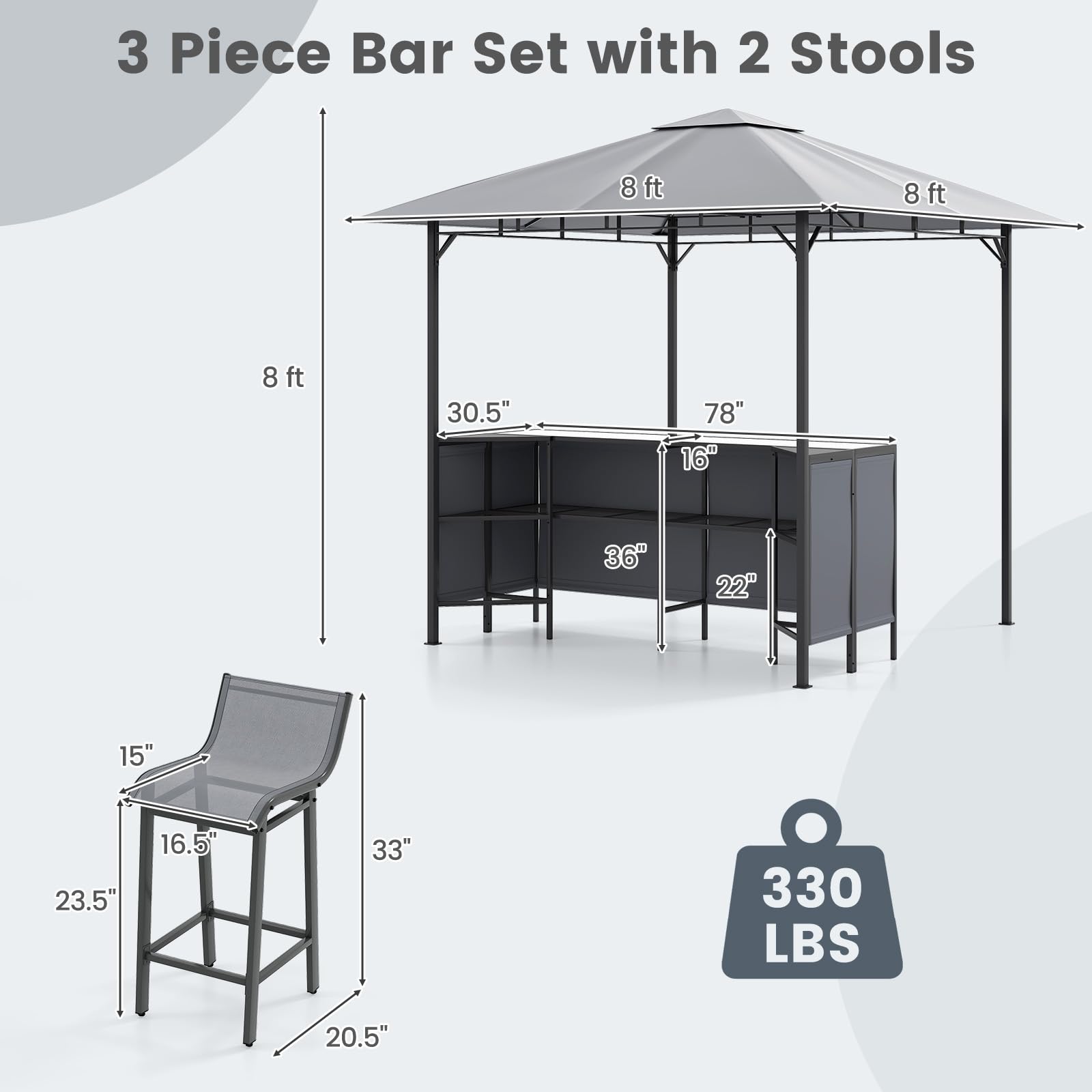 The 3-piece bar table set with gazebo allows you to enjoy outdoor dining or drinking without concern about sunburn. The compact design is meticulously crafted to complement any backyard, garden, or poolside area. The gazebo shelter boasts a powder-coated metal frame with a PU coated polyester canopy that shields against harsh sunlight and fading. Additionally, the canopy top is vented for added cool and stability. Thoughtfully, the 3 grill gazebo comes with ground stakes and expansions screws to ensure a stable standing on various ground surfaces. Additionally, the bar table showcases a heat-resistant tempered glass top ideal for serving drinks, along with handy storage shelves and glass holders for easy access to essential items. The ergonomically designed bar stools come with S-shaped mesh fabric seats and footrests, offering optimal comfort for extended conversations and unwinding sessions.