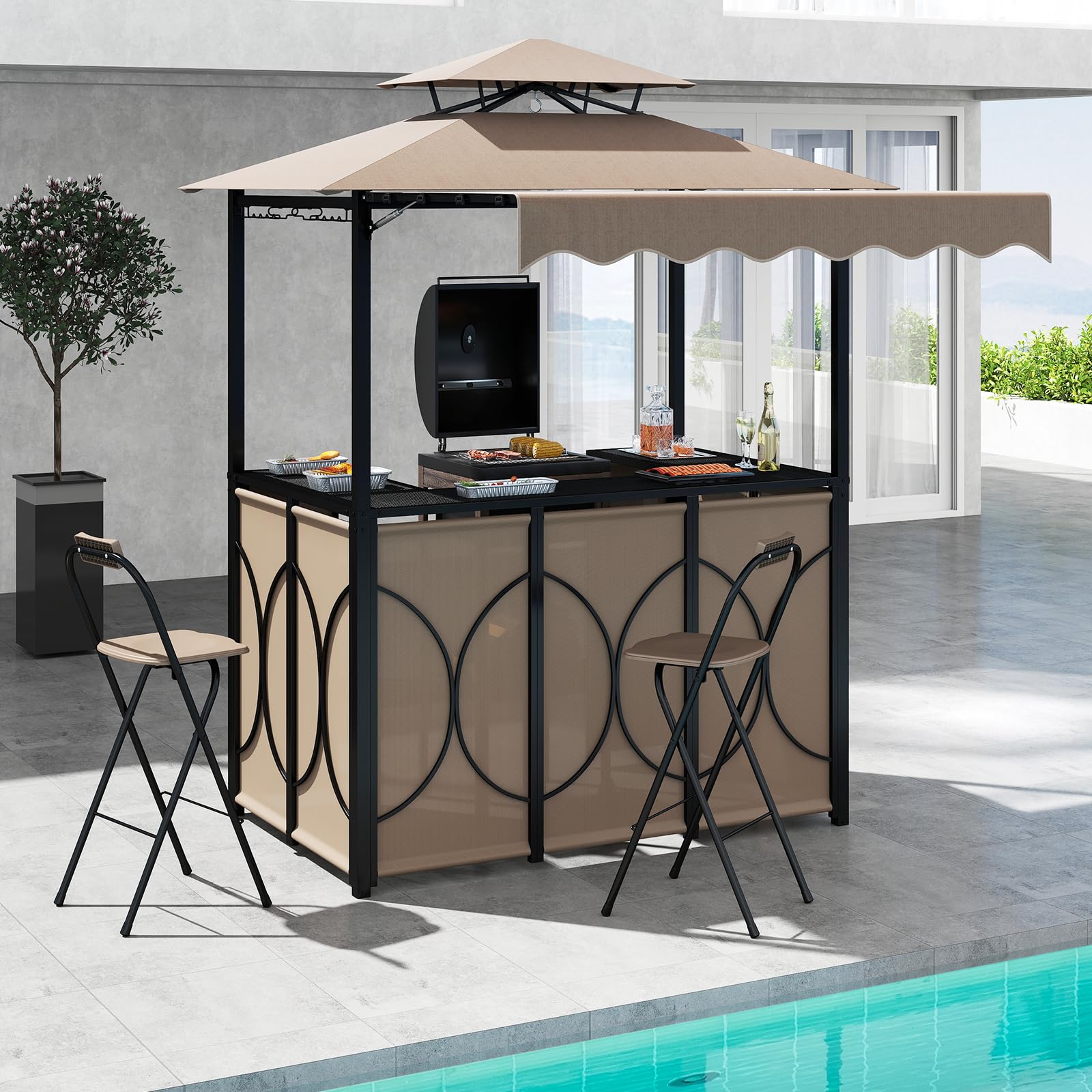 Our innovative grill gazebo not only provides a sheltered space for grilling regardless of the weather, but also enhances your entertaining capabilities with its built-in bar table and 2 foldable bar chairs, complete with metal shelves and glass holders, providing easy access to grilling accessories. The integrated extra awning on one side allows you to adjust the coverage for additional shade, effortlessly expanded or retracted with the latest hydraulic rods for your convenience. Additionally, the tent is crafted from a reliable polyester canopy and supported by a robust metal frame, which is built to withstand various weather conditions, ensuring long-term outdoor use. Thanks to its vented top and anchoring plates with 8 ground stakes, the gazebo could keep stake even in breezy conditions. Whether you're hosting a party or enjoying a quiet family dinner, this barbecue gazebo with its thoughtful features and stylish appearance makes it a must-have for any outdoor space!