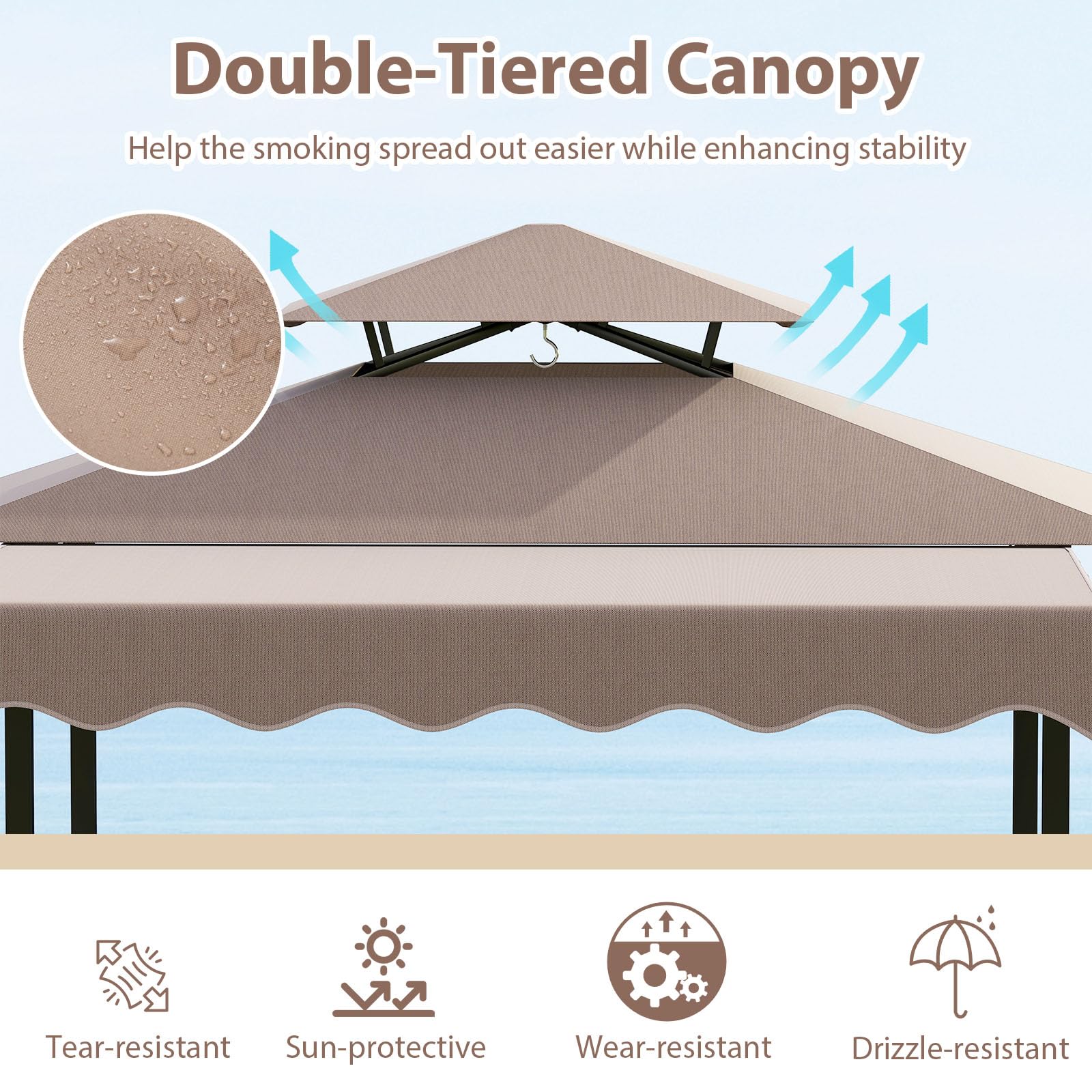 The canopy is drizzle-resistant, sun-protective, tear-resistant, and wear-resistant