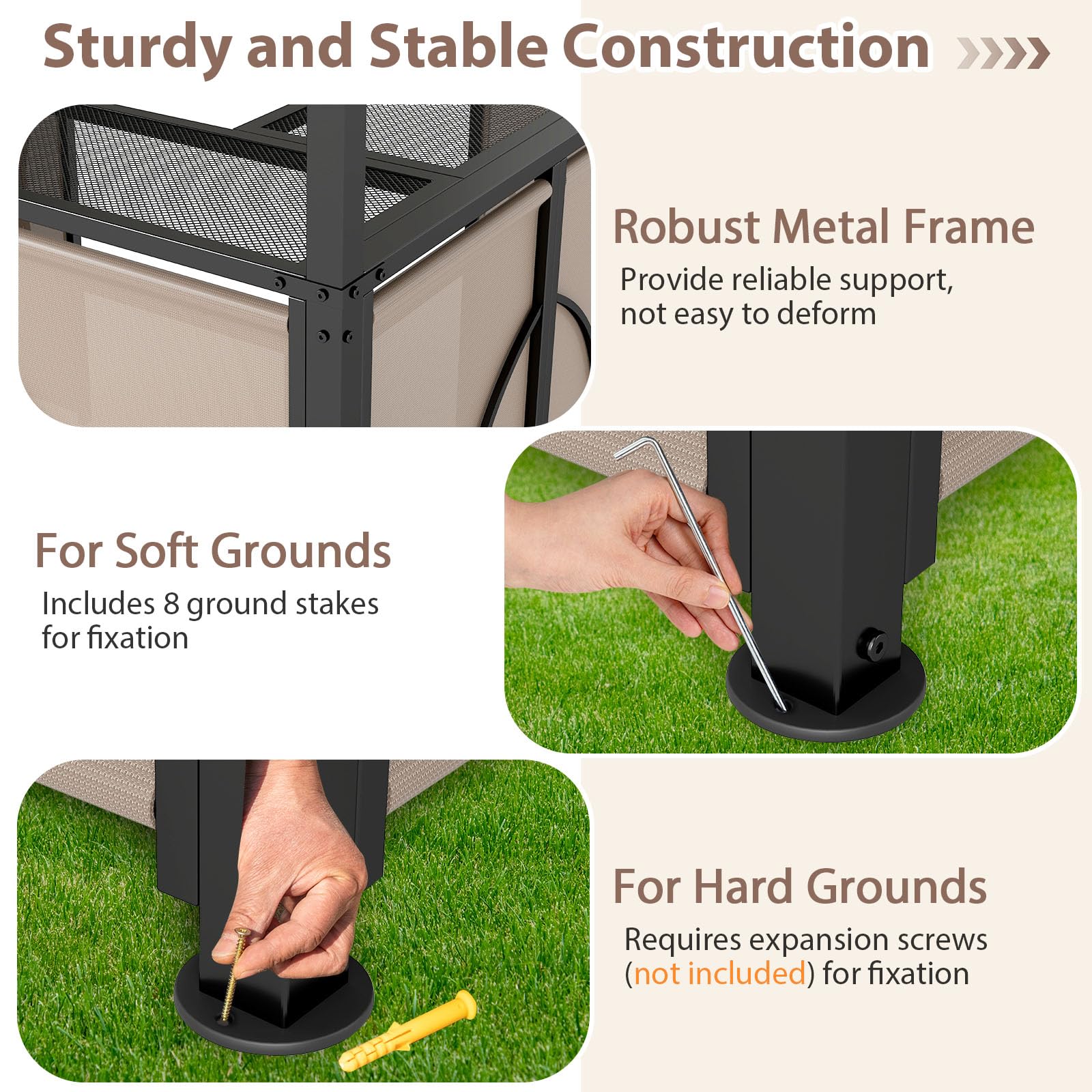 For hard ground, requires expansion screws (not included) for fixation