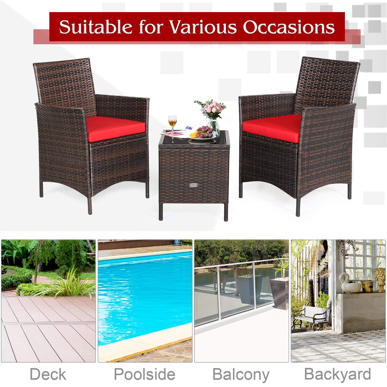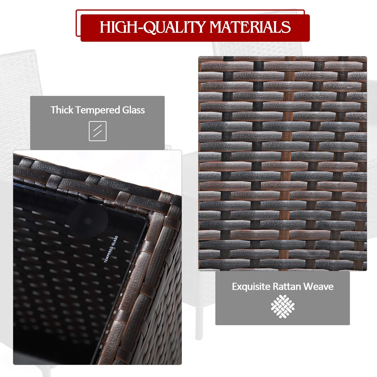 We present you our 3-piece rattan patio conversation set for a comfortable experience in your leisure time. This set of outdoor furniture is built from premium rattan and sturdy steel. Therefore, durability and long service life are what it offers. Besides, the thick soft cushions are comfortable and breathable, thus relieving fatigue instantly. The removable seat covers and tempered glass table-top can be cleaned easily. Next, when it comes to appearance, its modern and stylish lines make it a perfect embellishment for the backyard, patio, balcony, and other spaces. This furniture set is your ideal choice if you're wanting of a comfortable rattan bistro set.