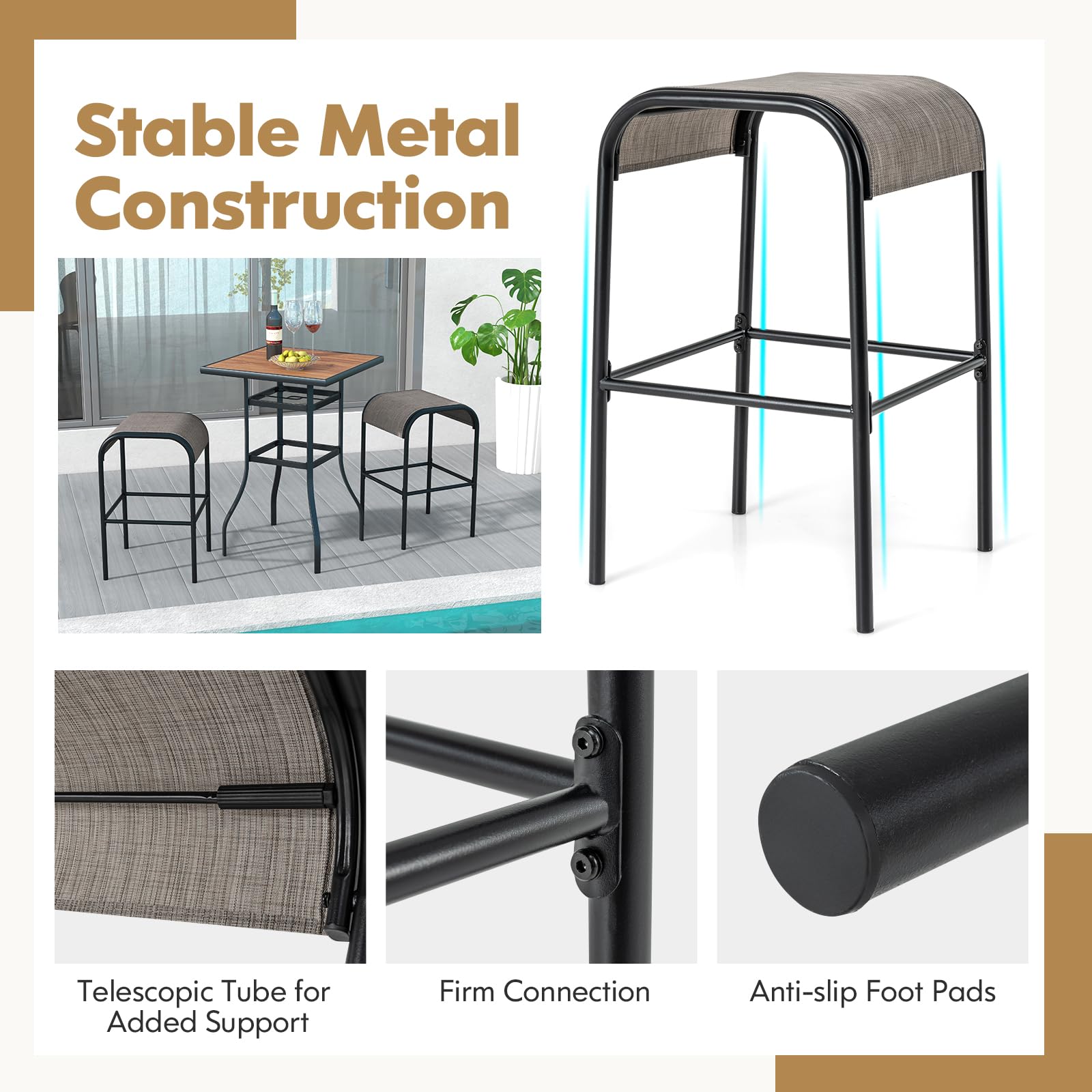 Designed for both comfort and functionality, this set includes a 27.5" bar height table and 2 30" barstools, perfect for intimate gatherings or family meals. The barstools feature breathable fabric seats and sturdy footrests for ultimate comfort. The patio bar table comes with a 1.5" umbrella hole, allowing you to easily add shade to your dining area, enhancing your outdoor experience on sunny days. What's more, the table and stools are made from robust metal frame, ensuring high stability and durability to withstand the test of time. Whether you're hosting a poolside party, enjoying a meal in your garden, or simply relaxing on your lawn, this set is the perfect choice.