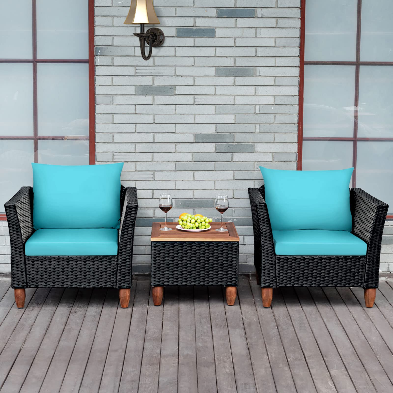 The sofa set is crafted with steel and wrapped with premium wicker, which ensures the sturdiness and durability of set. And the feet are made of solid wood which add sturdiness of the set. They also can be adjusted to apply for uneven ground. Plus, the sofas are equipped with back and seat cushion add excellent comfort for you. And the cover of cushion is designed with smooth zipper for removing and cleaning easily. The coffee table is equipped with a thick acacia wood top for placing foods, drinks or decors. This rattan furniture set will go well with various home styles, which is a perfect complement for your house.