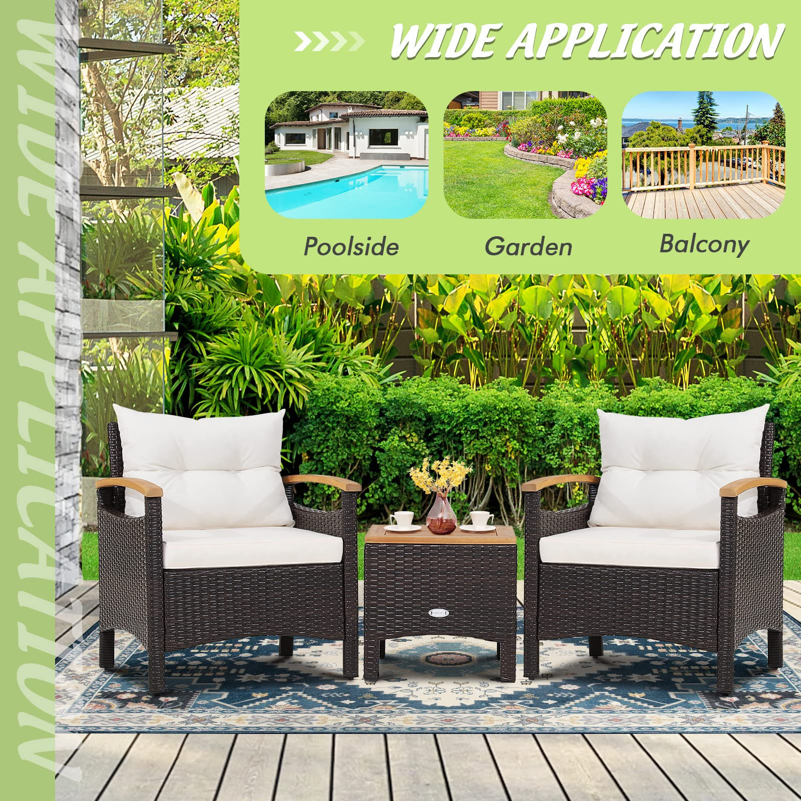 • Elegant Style & Wide Application: With an elegant appearance, this 3-piece patio rattan set fits well with the outdoor environment or interior decoration style. You can place it on the poolside, porch, balcony, etc. Whether used separately or in combination, this versatile rattan furniture set will be the highlight of your space.