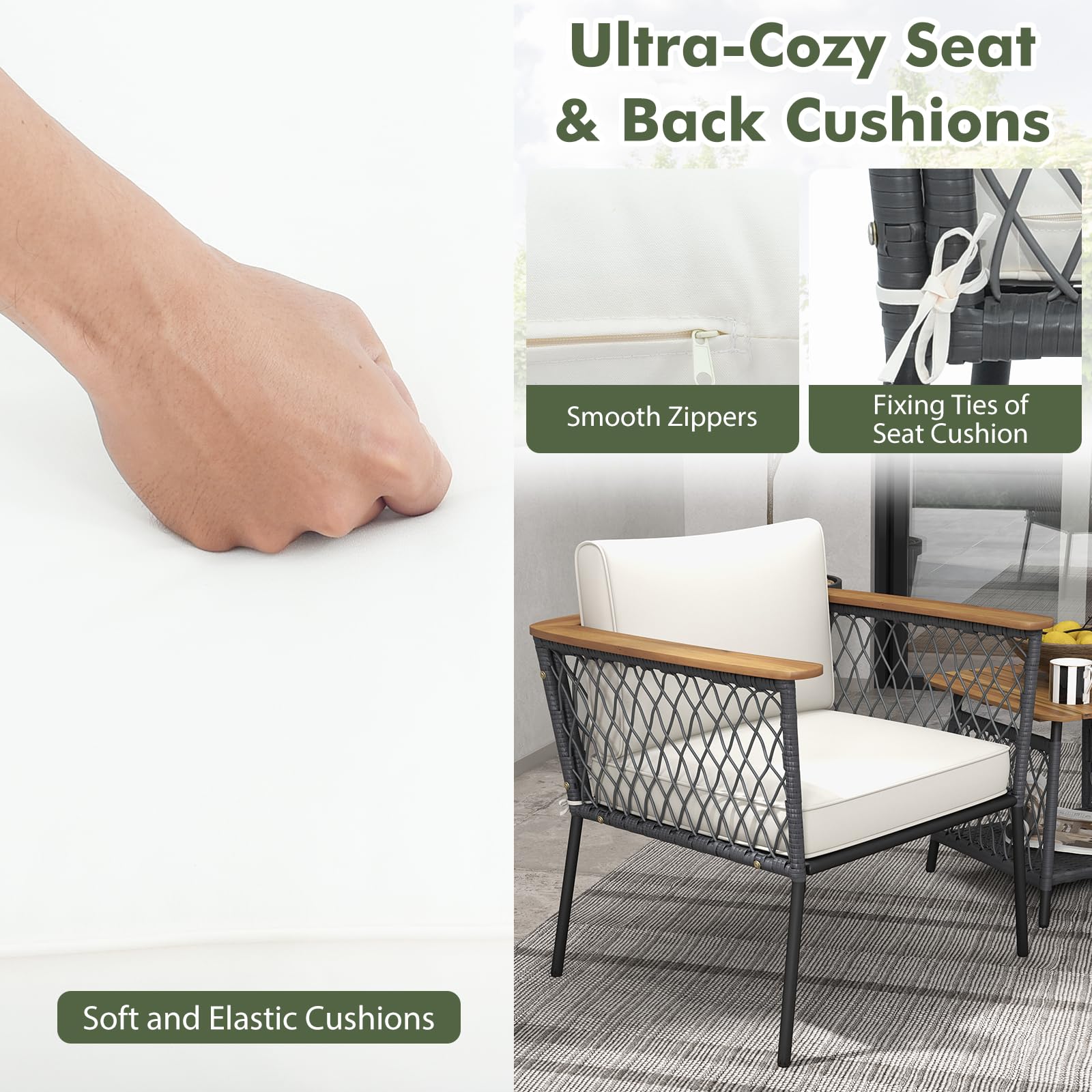 - Double-Tier Coffee Table: This 3-piece patio set also comes with a 2-tier coffee table featuring wood tabletop and rattan shelf, providing ample space for drinks, snacks, and magazines.